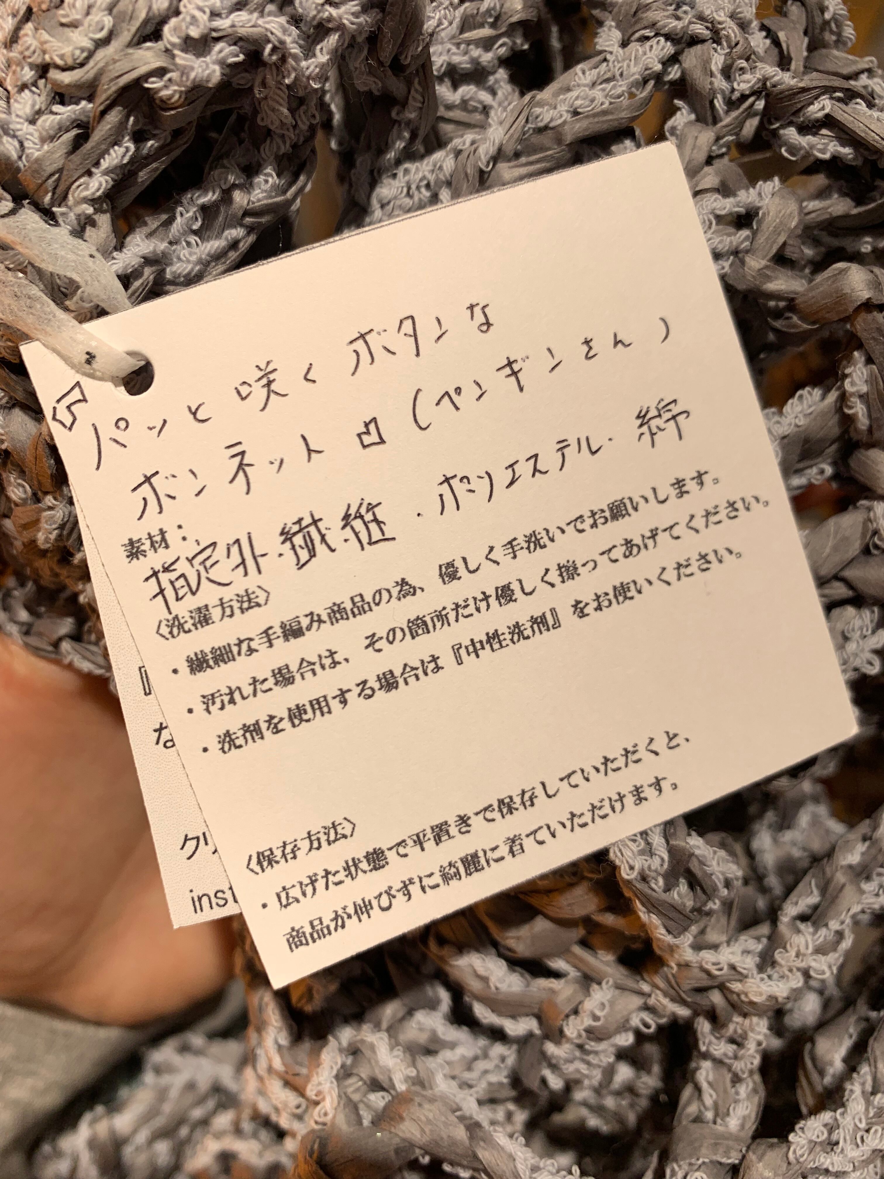 「パッと咲くボタンなボンネット」 ペンギンさん 〈素材〉 指定外繊維・綿・ポリエステル 〈洗濯方法〉 繊細な手編み商品の為、優しく手洗いでお願いします。 汚れた場合は、その箇所だけ優しく擦ってあげてください。 洗剤を使用する場合は中性洗剤をお使いください。