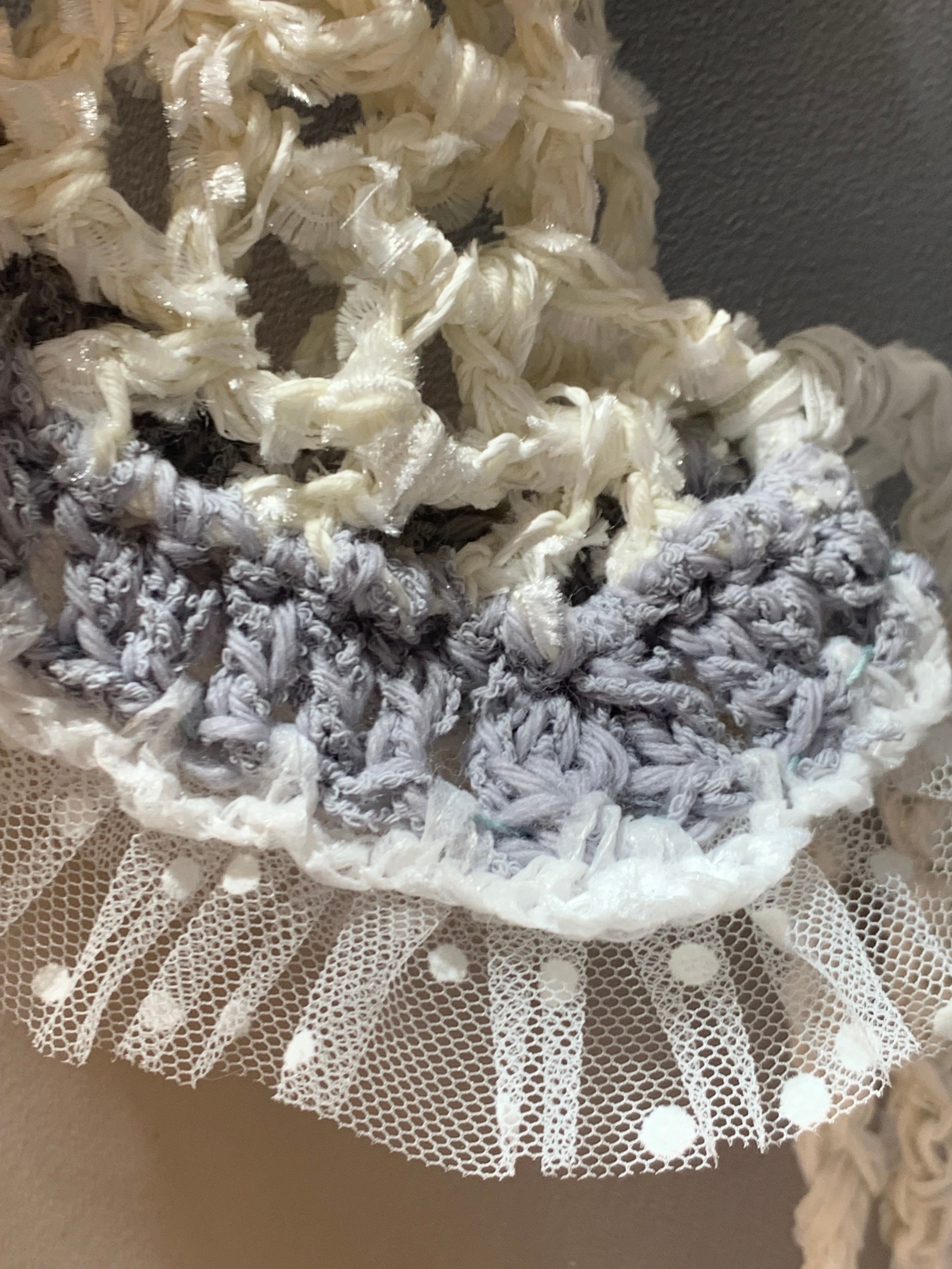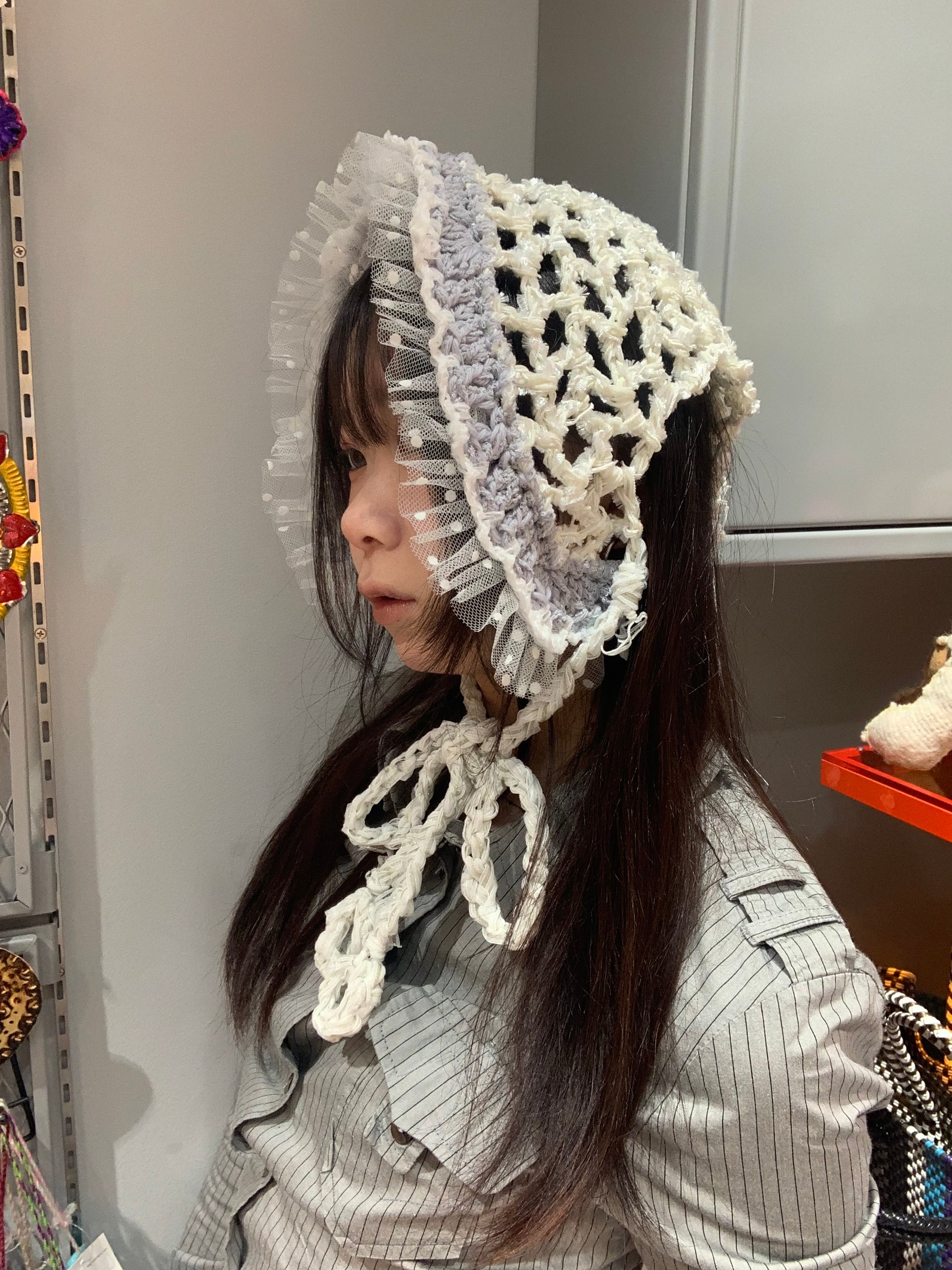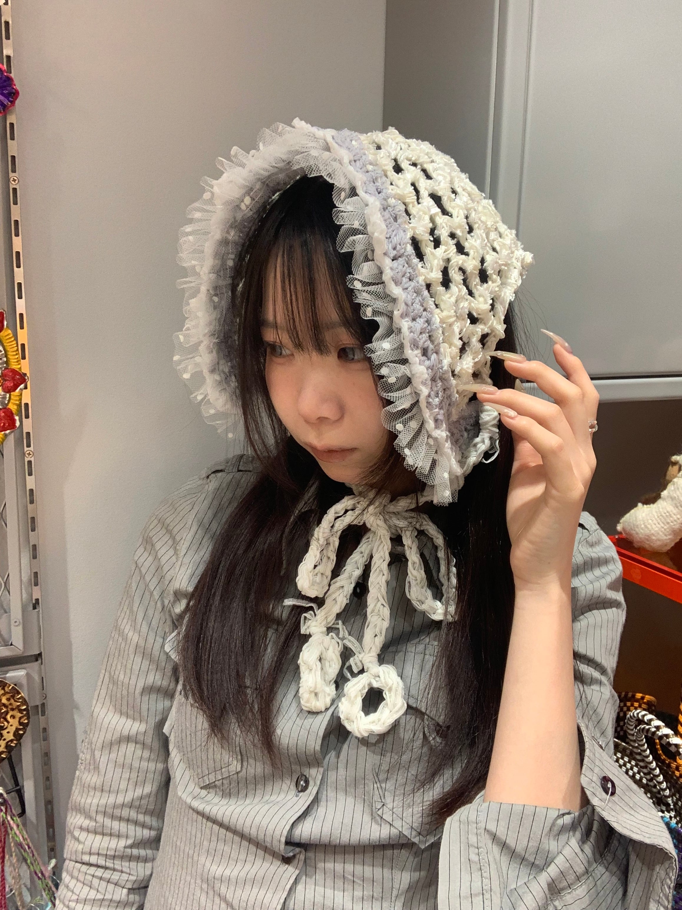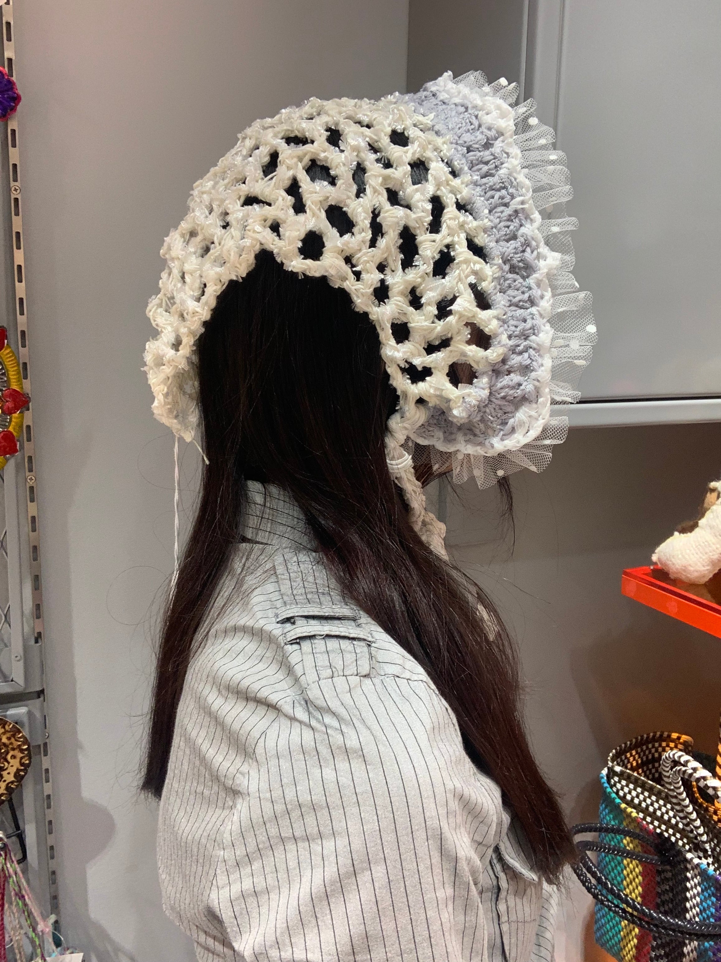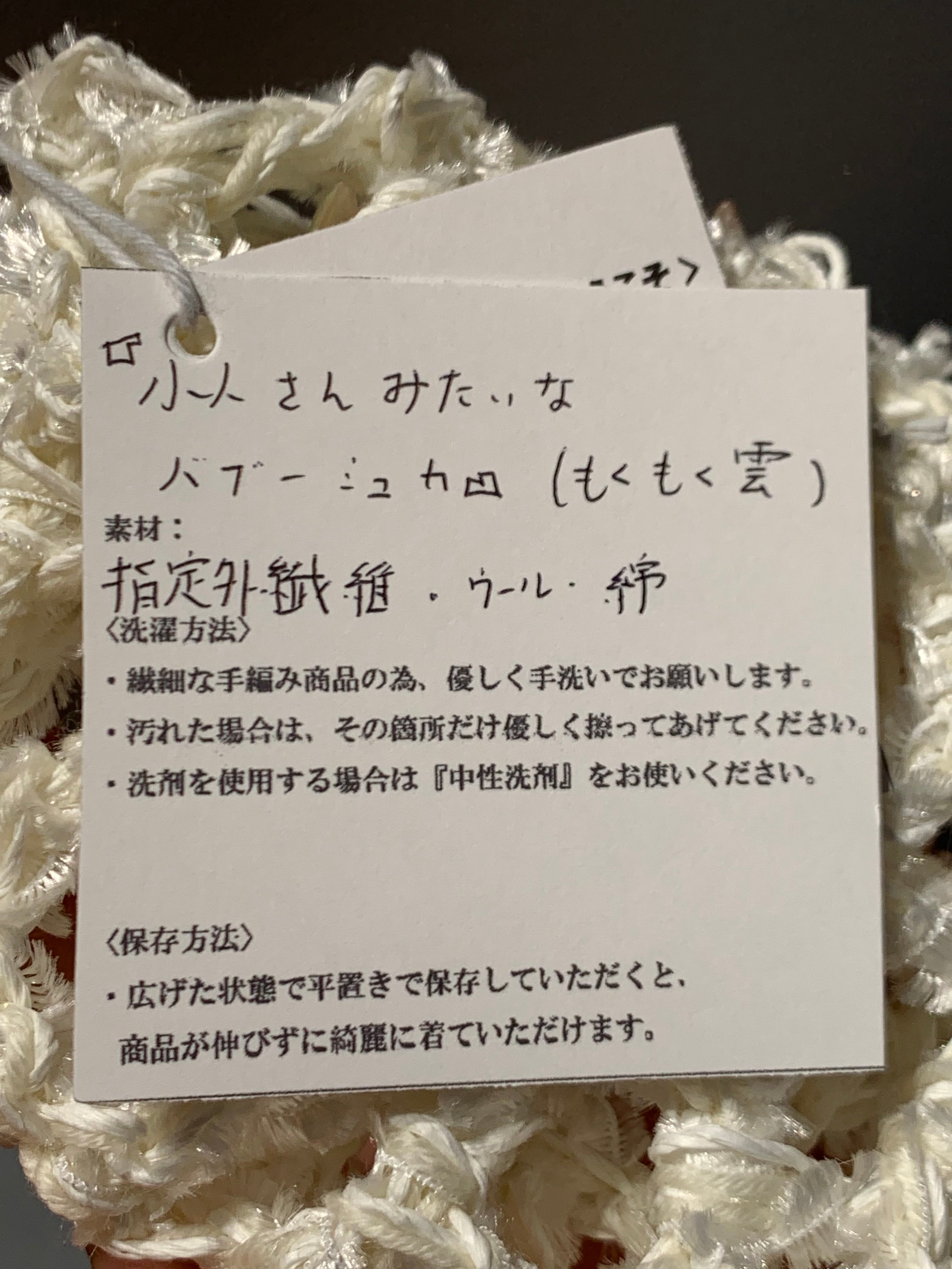 「小人さんみたいなバブーシュカ」 もくもく雲 〈素材〉 指定外繊維・綿・ウール 〈洗濯方法〉 繊細な手編み商品の為、優しく手洗いでお願いします。 汚れた場合は、その箇所だけ優しく擦ってあげてください。 洗剤を使用する場合は中性洗剤をお使いください。
