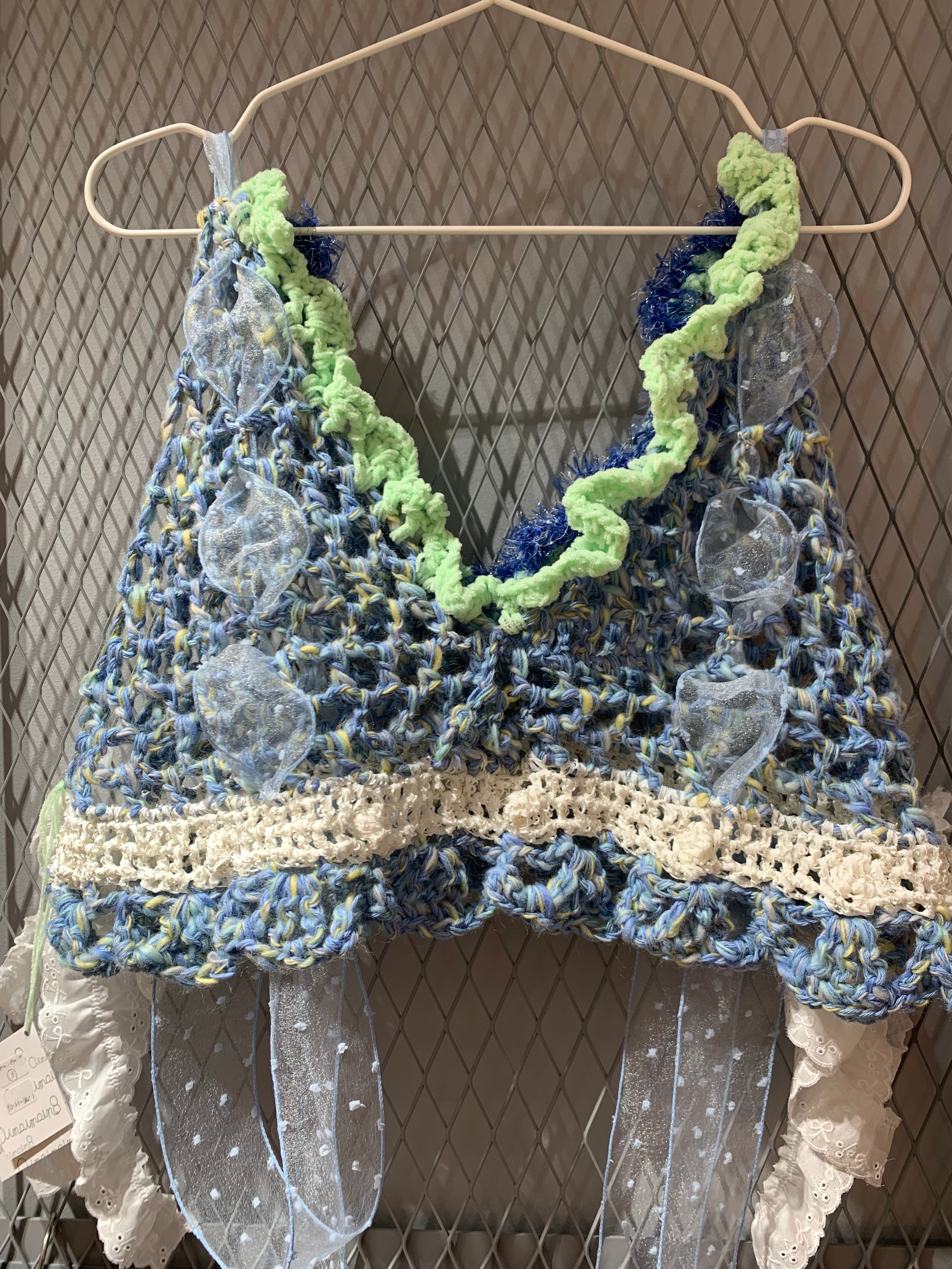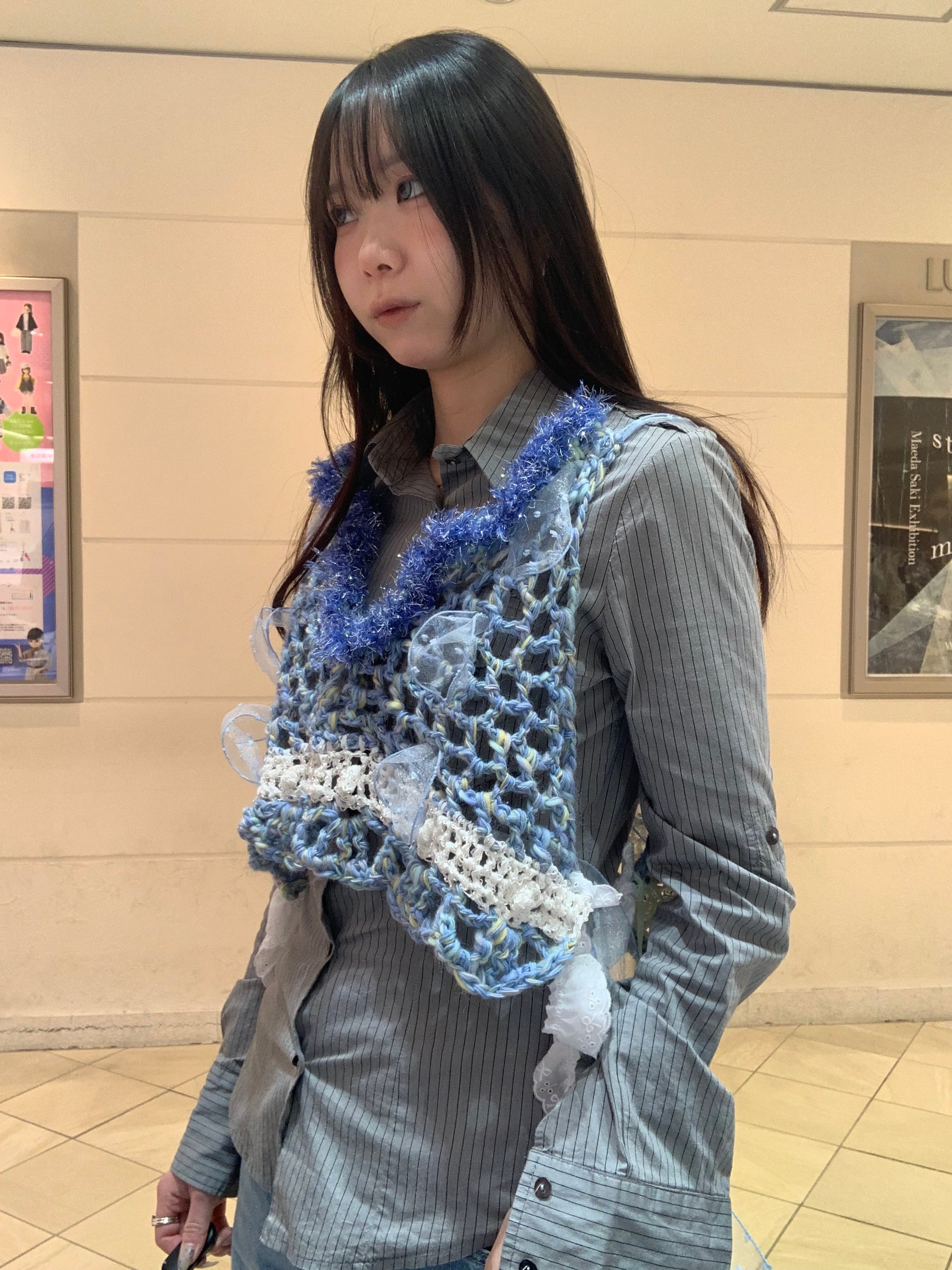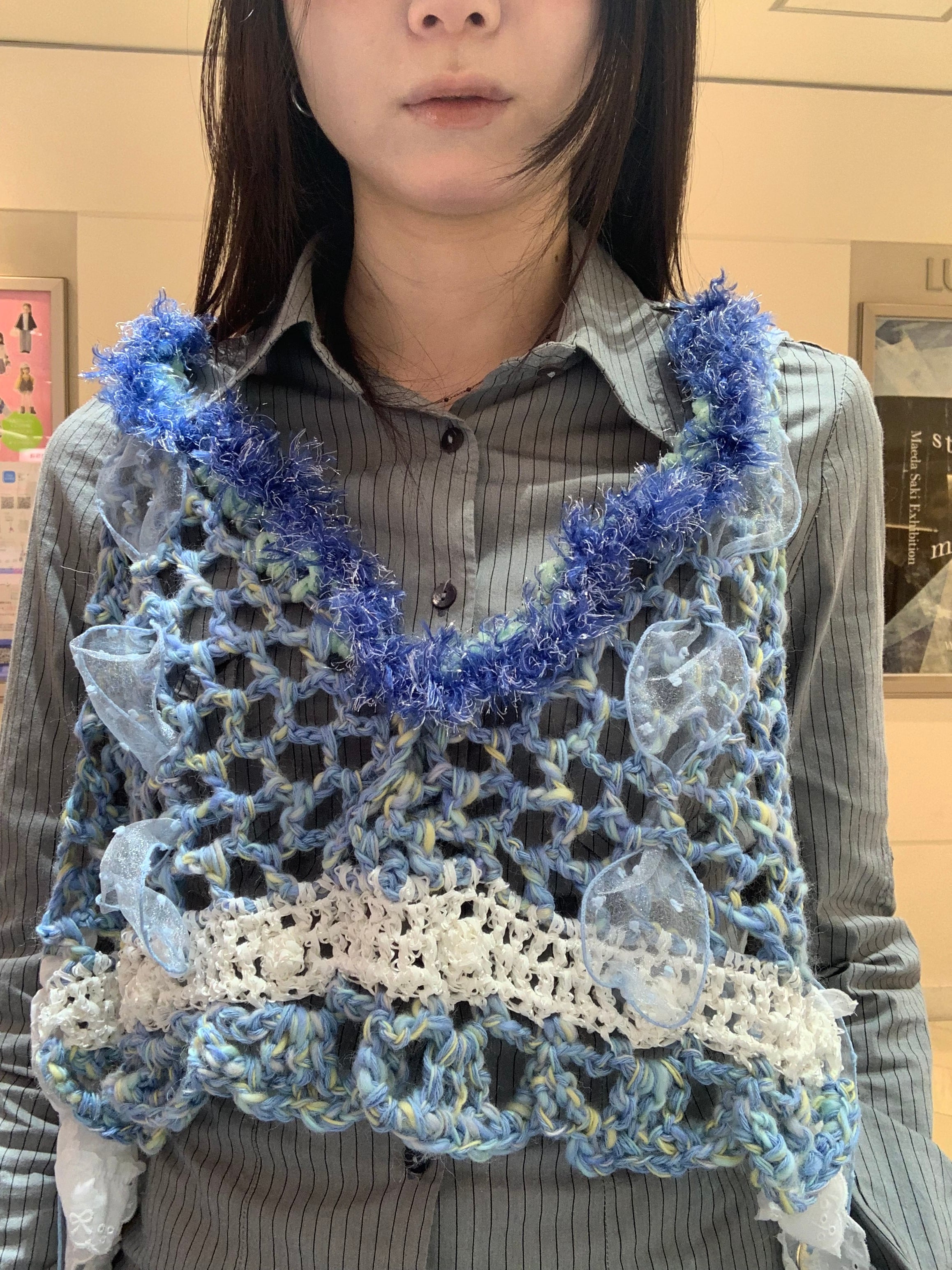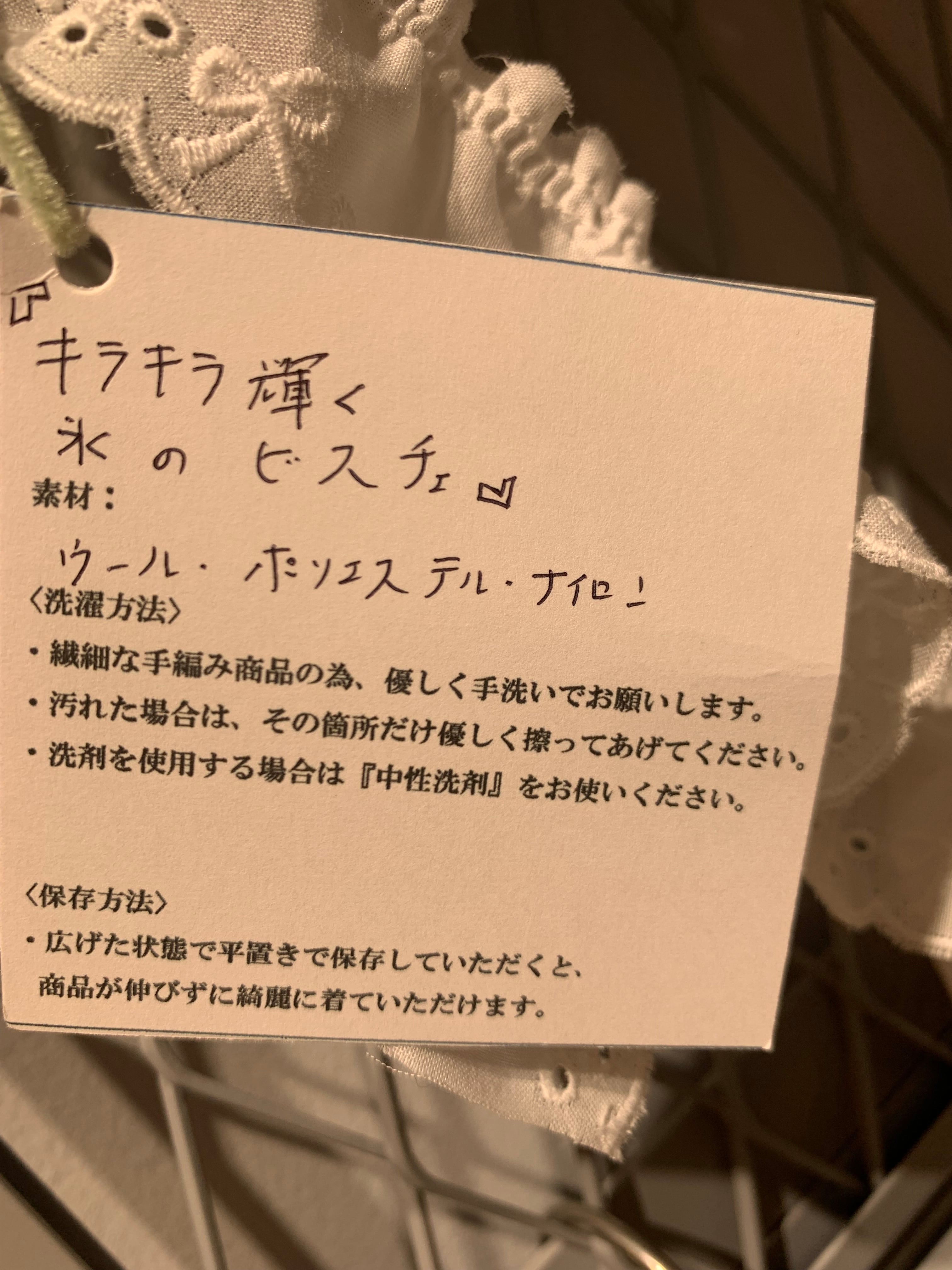 「キラキラ輝く氷のビスチェ」 〈素材〉 ウール・ポリエステル・ナイロン 〈洗濯方法〉 繊細な手編み商品の為、優しく手洗いでお願いします。 汚れた場合は、その箇所だけ優しく擦ってあげてください。 洗剤を使用する場合は中性洗剤をお使いください。