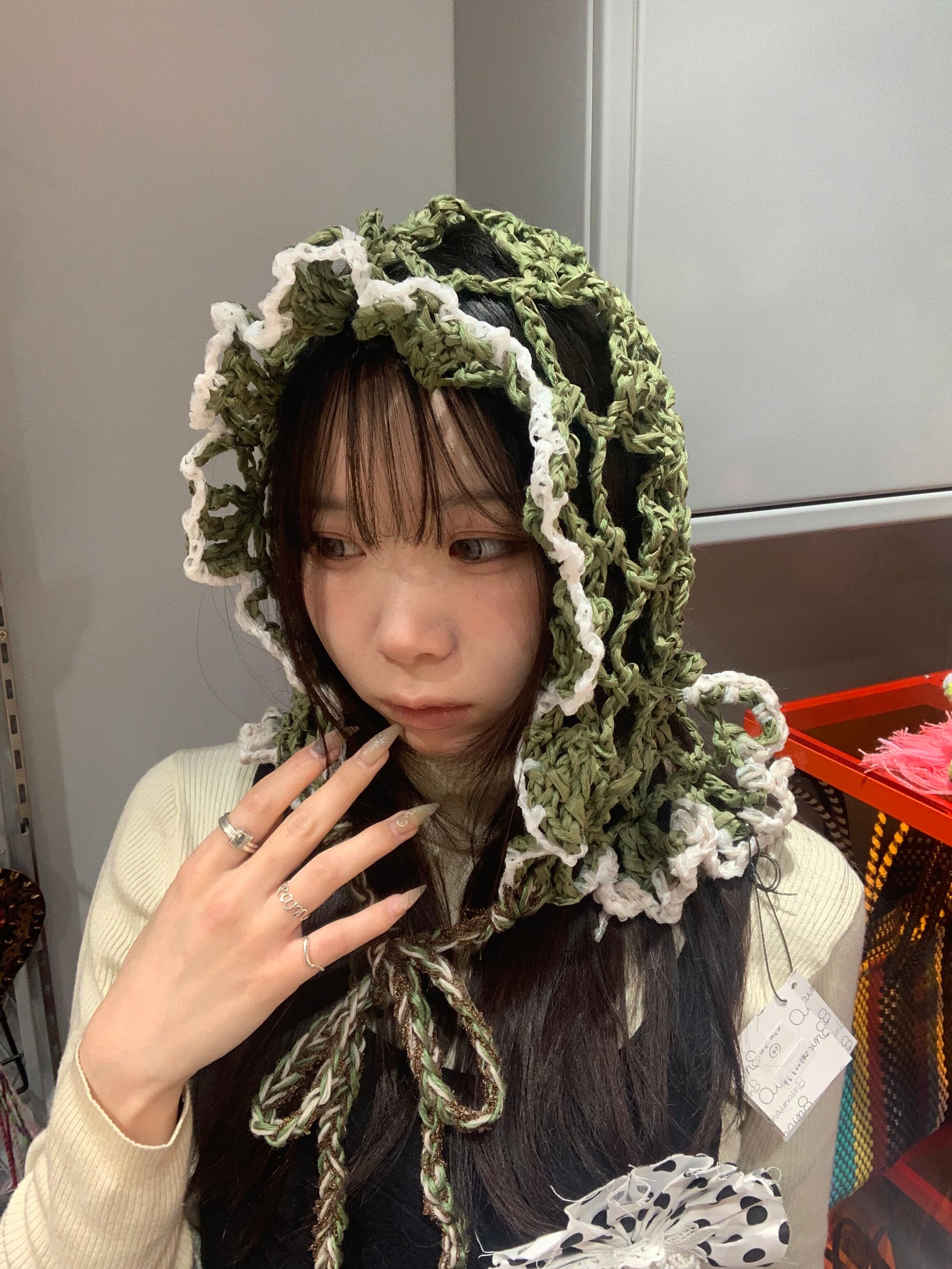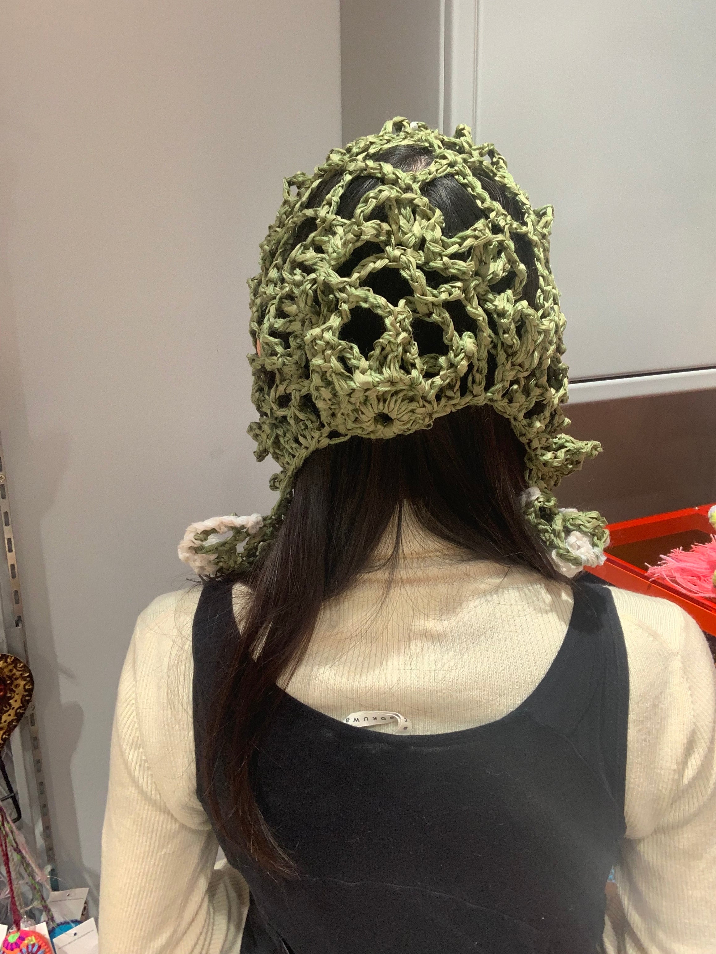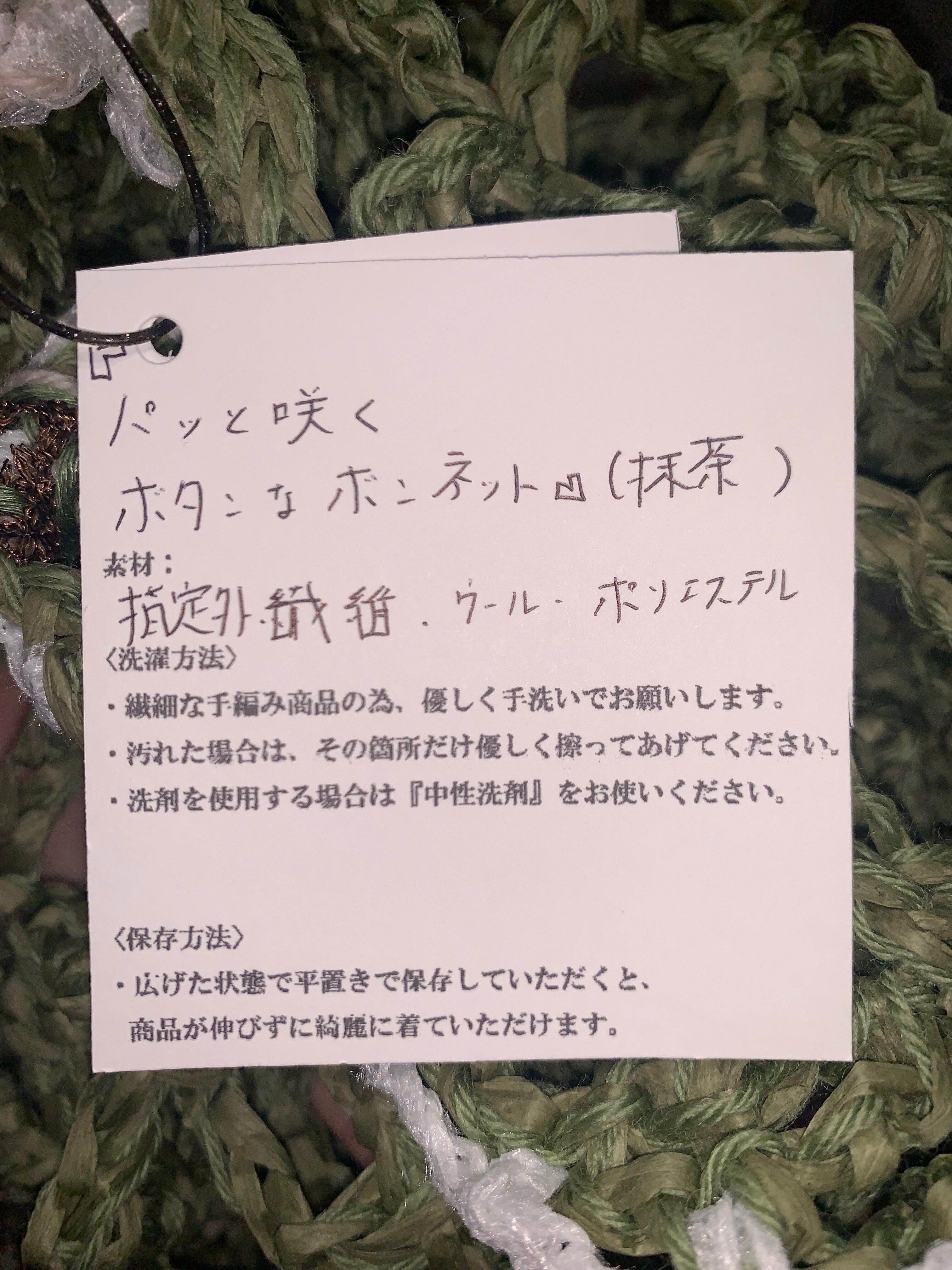 「パッと咲くボタンなボンネット」 抹茶 〈素材〉 指定外繊維・ポリエステル・ウール 〈洗濯方法〉 繊細な手編み商品の為、優しく手洗いでお願いします。 汚れた場合は、その箇所だけ優しく擦ってあげてください。 洗剤を使用する場合は中性洗剤をお使いください。