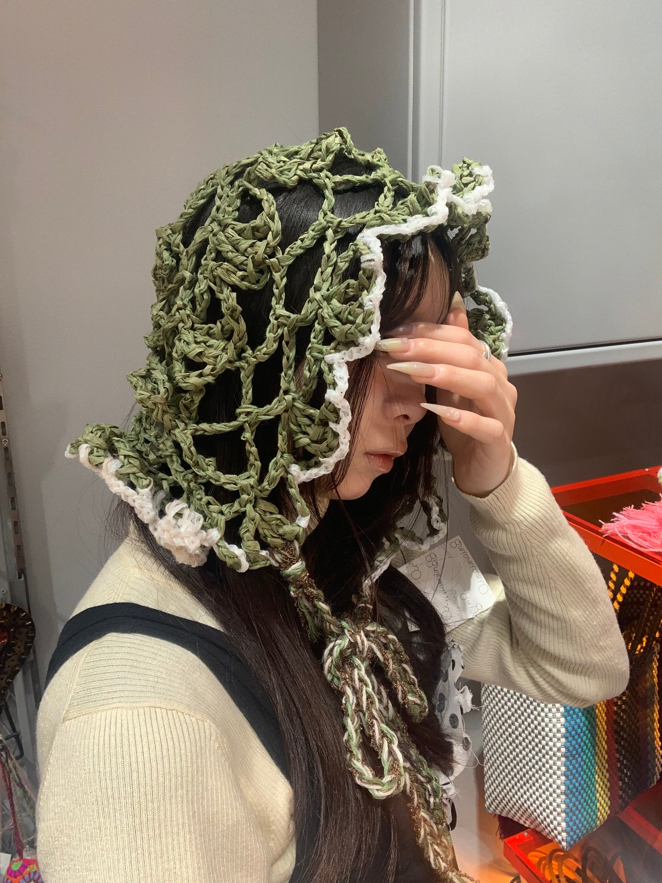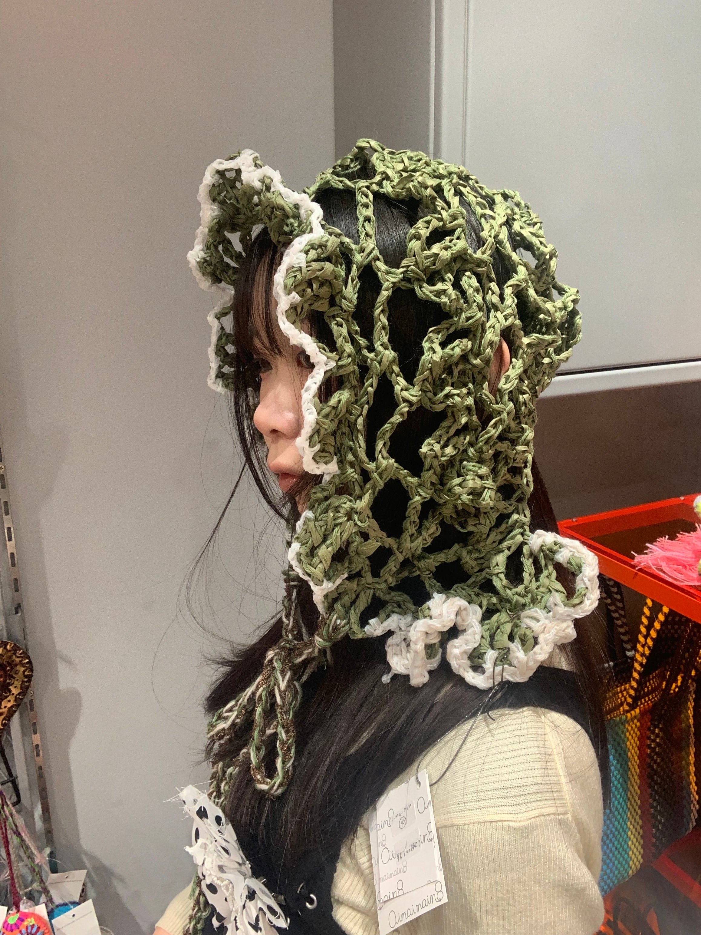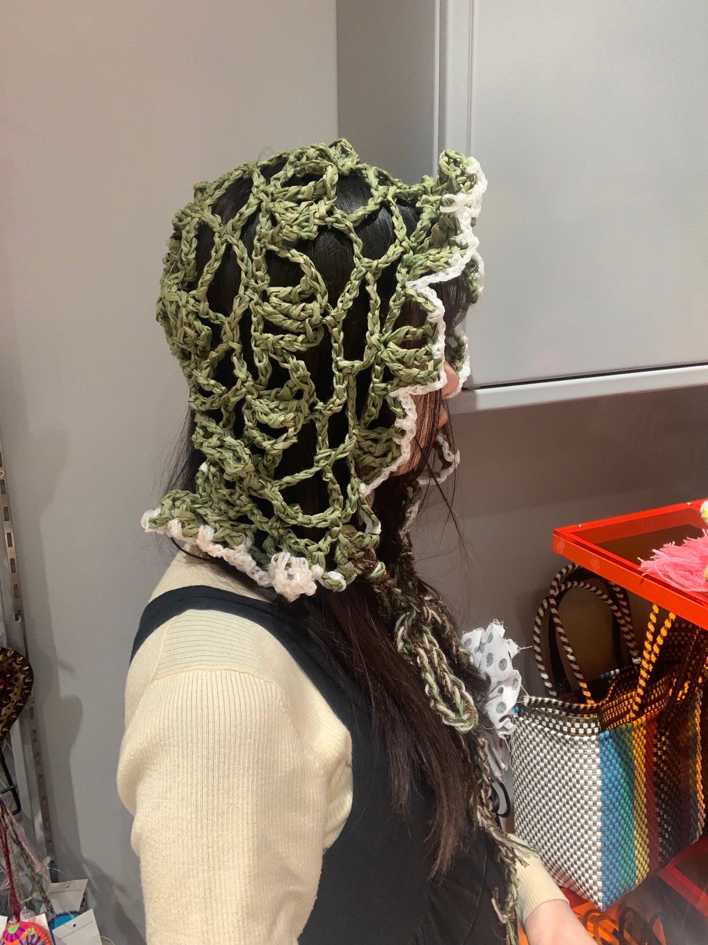 「パッと咲くボタンなボンネット」 抹茶 〈素材〉 指定外繊維・ポリエステル・ウール 〈洗濯方法〉 繊細な手編み商品の為、優しく手洗いでお願いします。 汚れた場合は、その箇所だけ優しく擦ってあげてください。 洗剤を使用する場合は中性洗剤をお使いください。