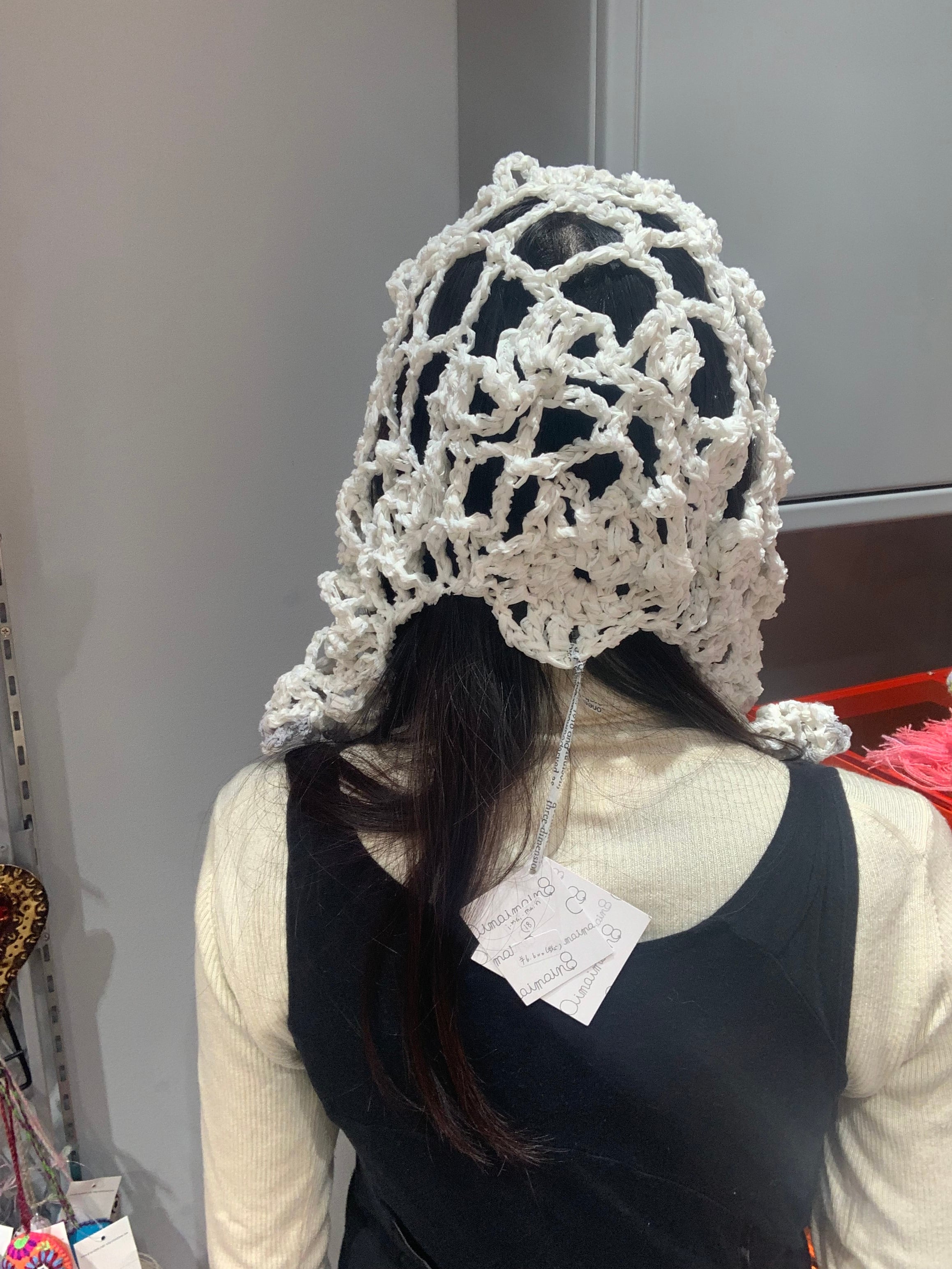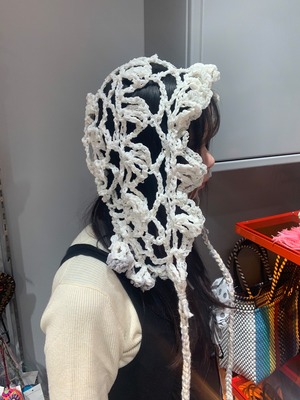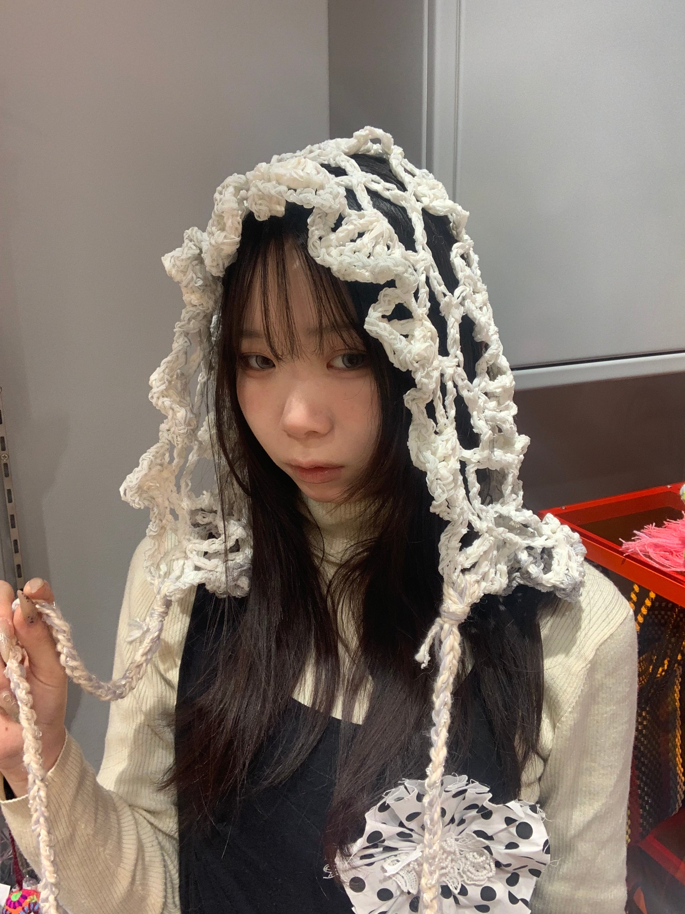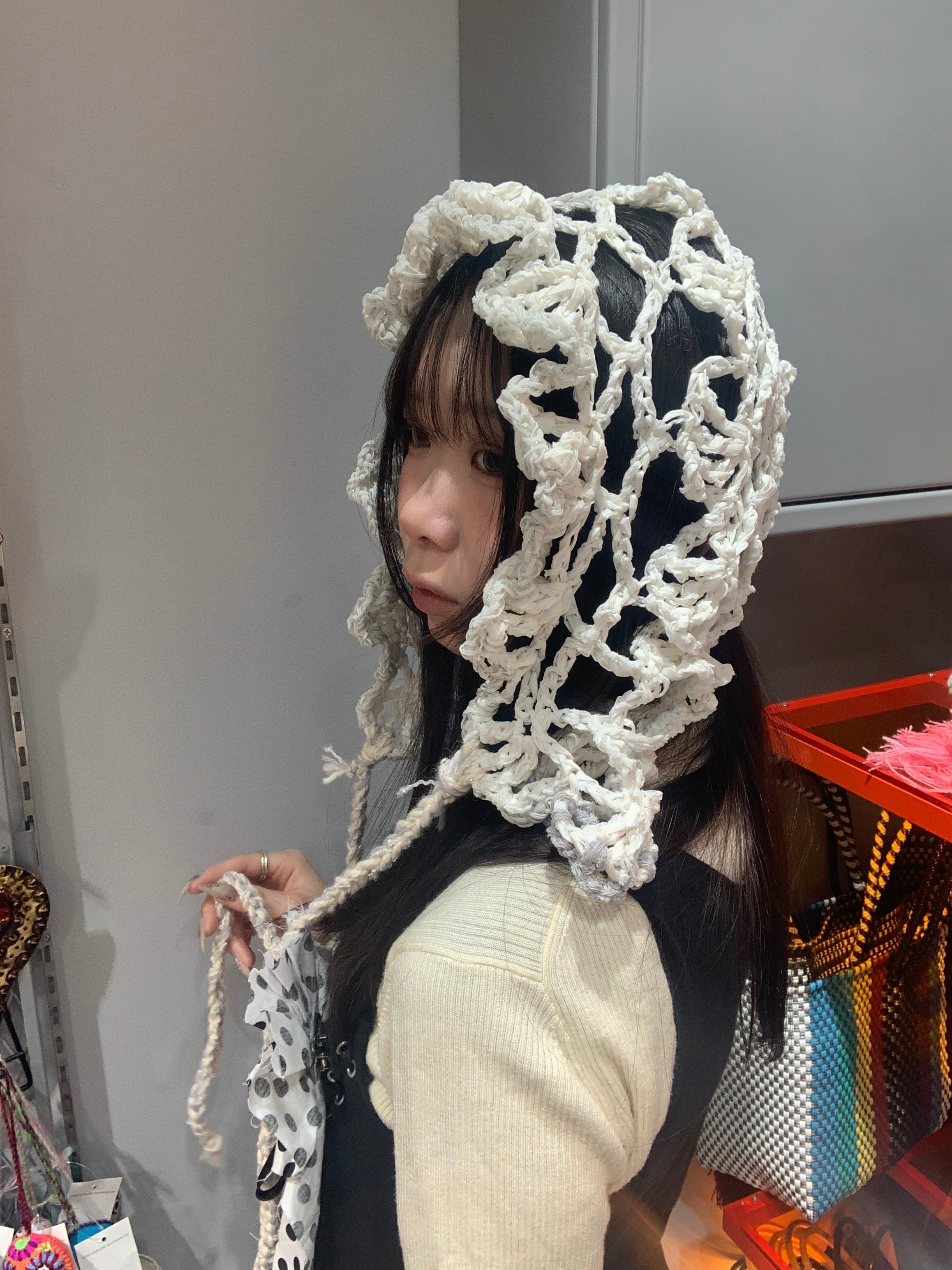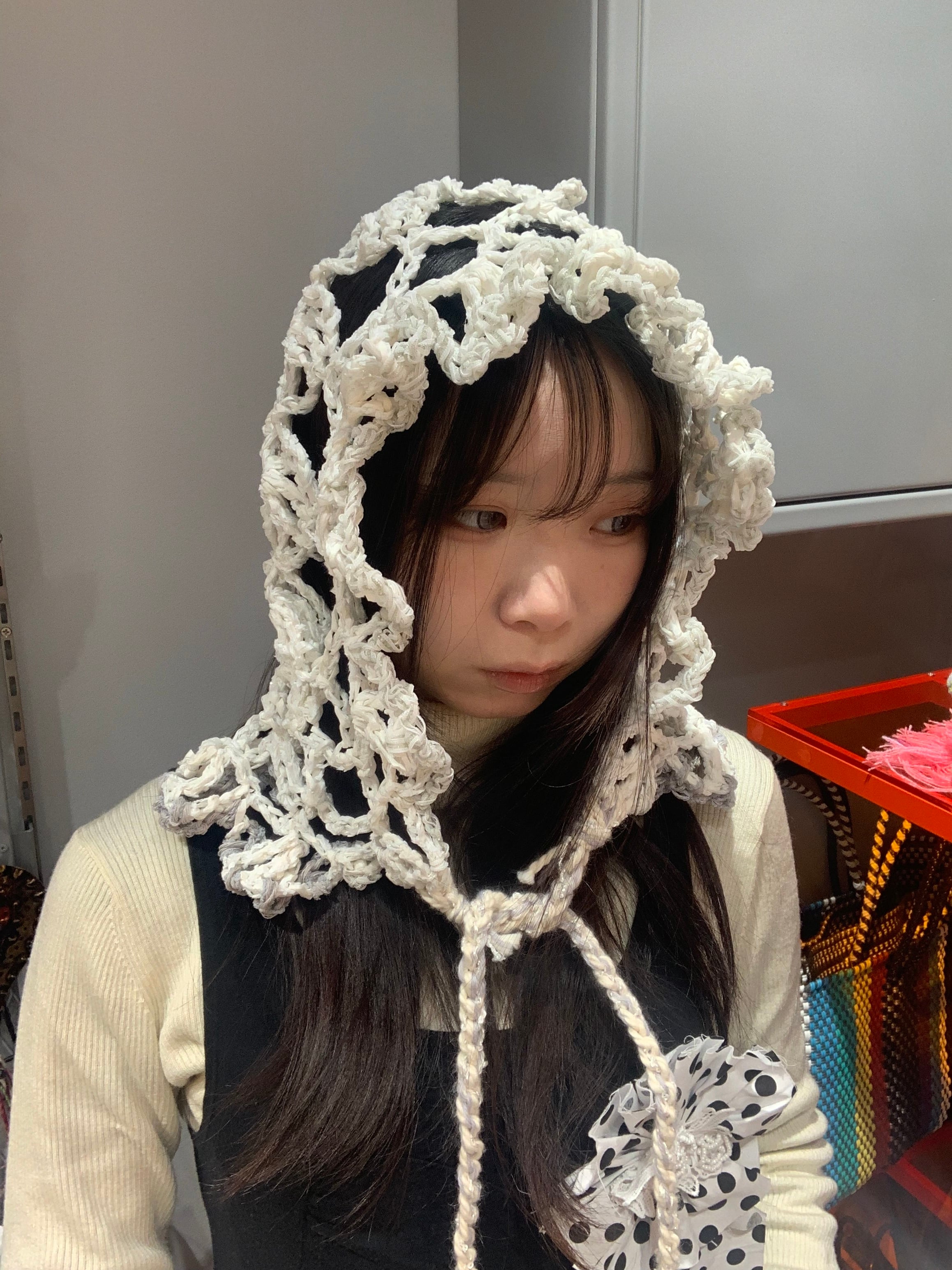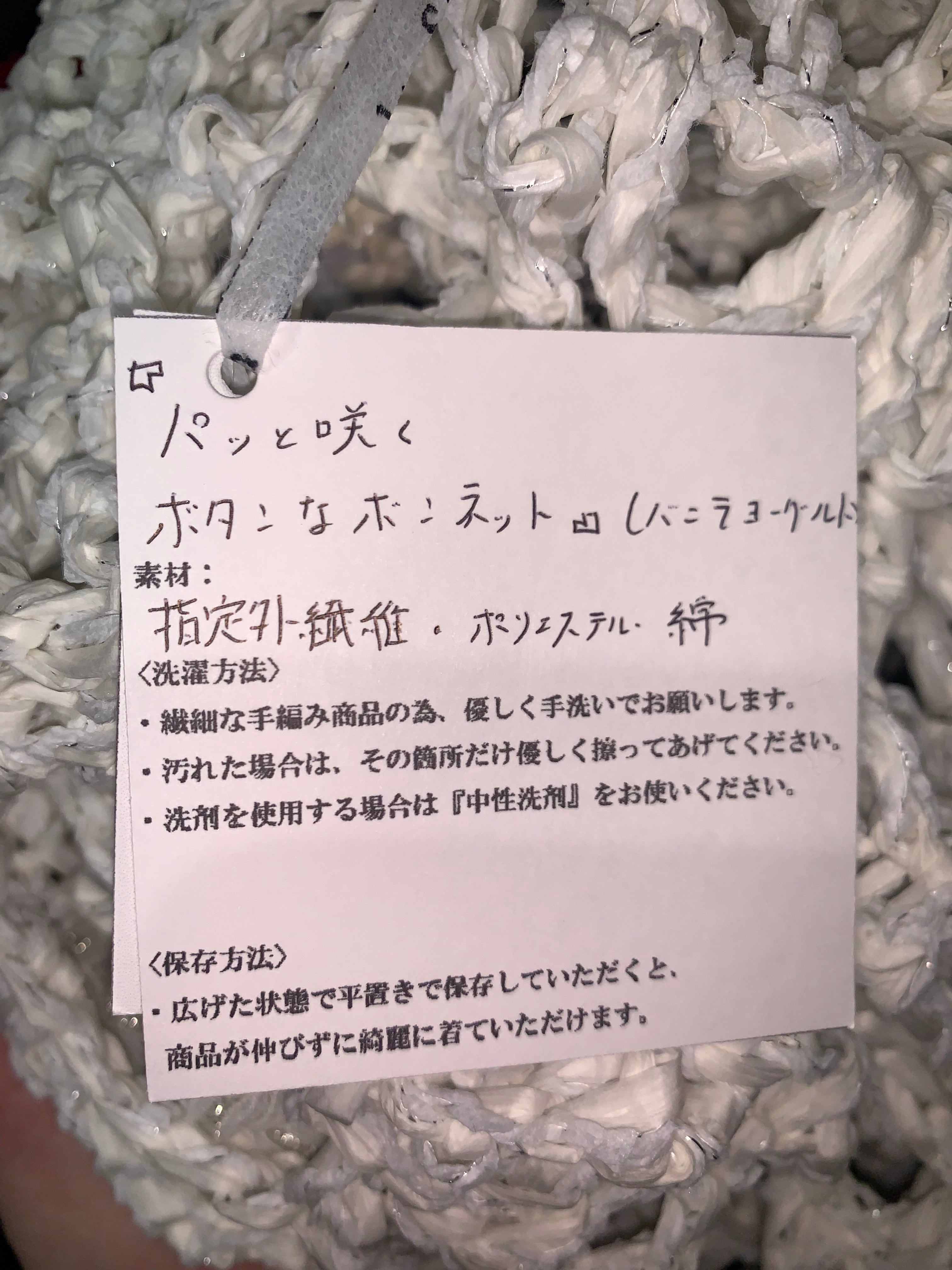 「パッと咲くボタンなボンネット」 バニラヨーグルト 〈素材〉 指定外繊維・ポリエステル・綿 〈洗濯方法〉 繊細な手編み商品の為、優しく手洗いでお願いします。 汚れた場合は、その箇所だけ優しく擦ってあげてください。 洗剤を使用する場合は中性洗剤をお使いください。