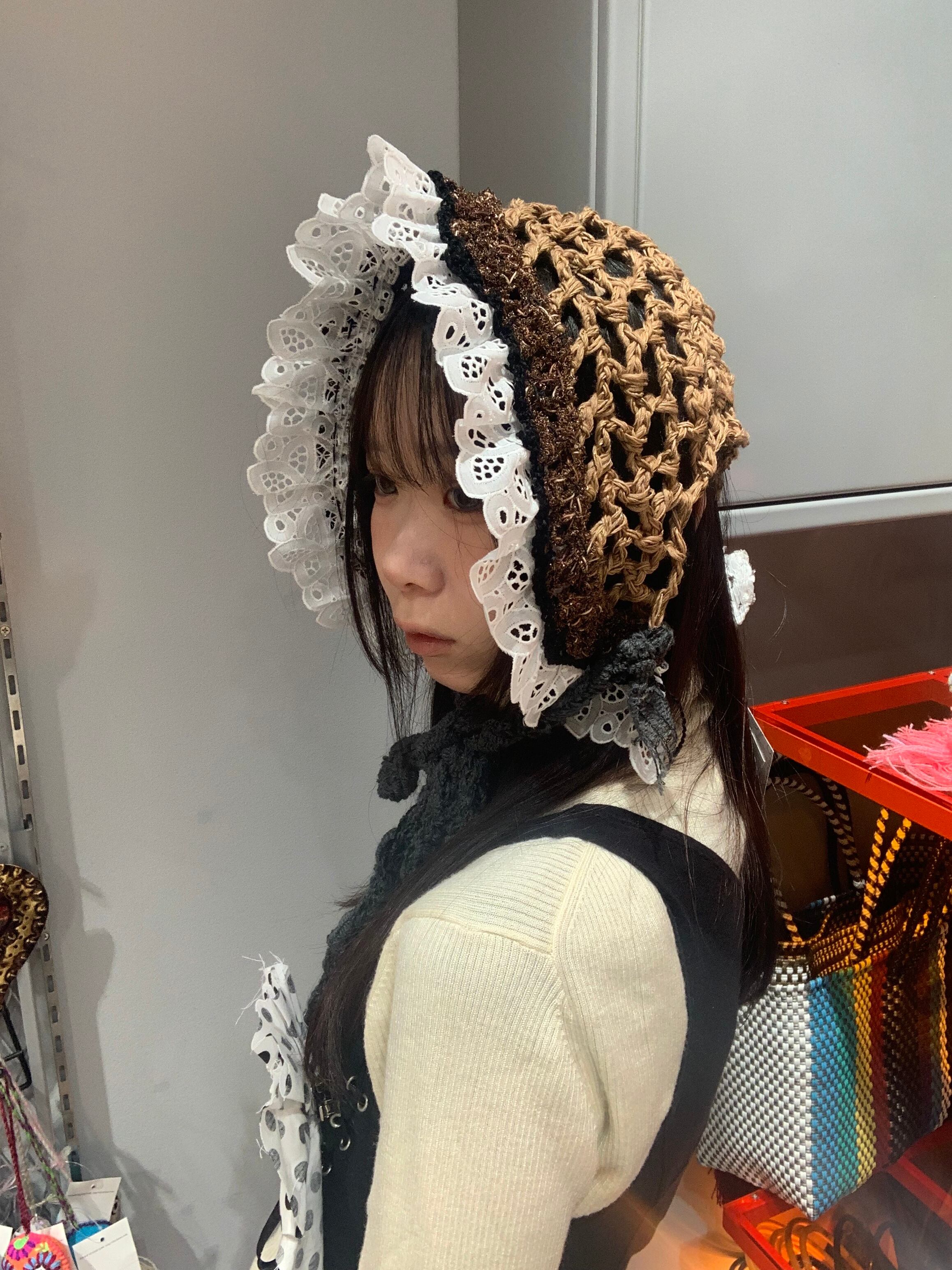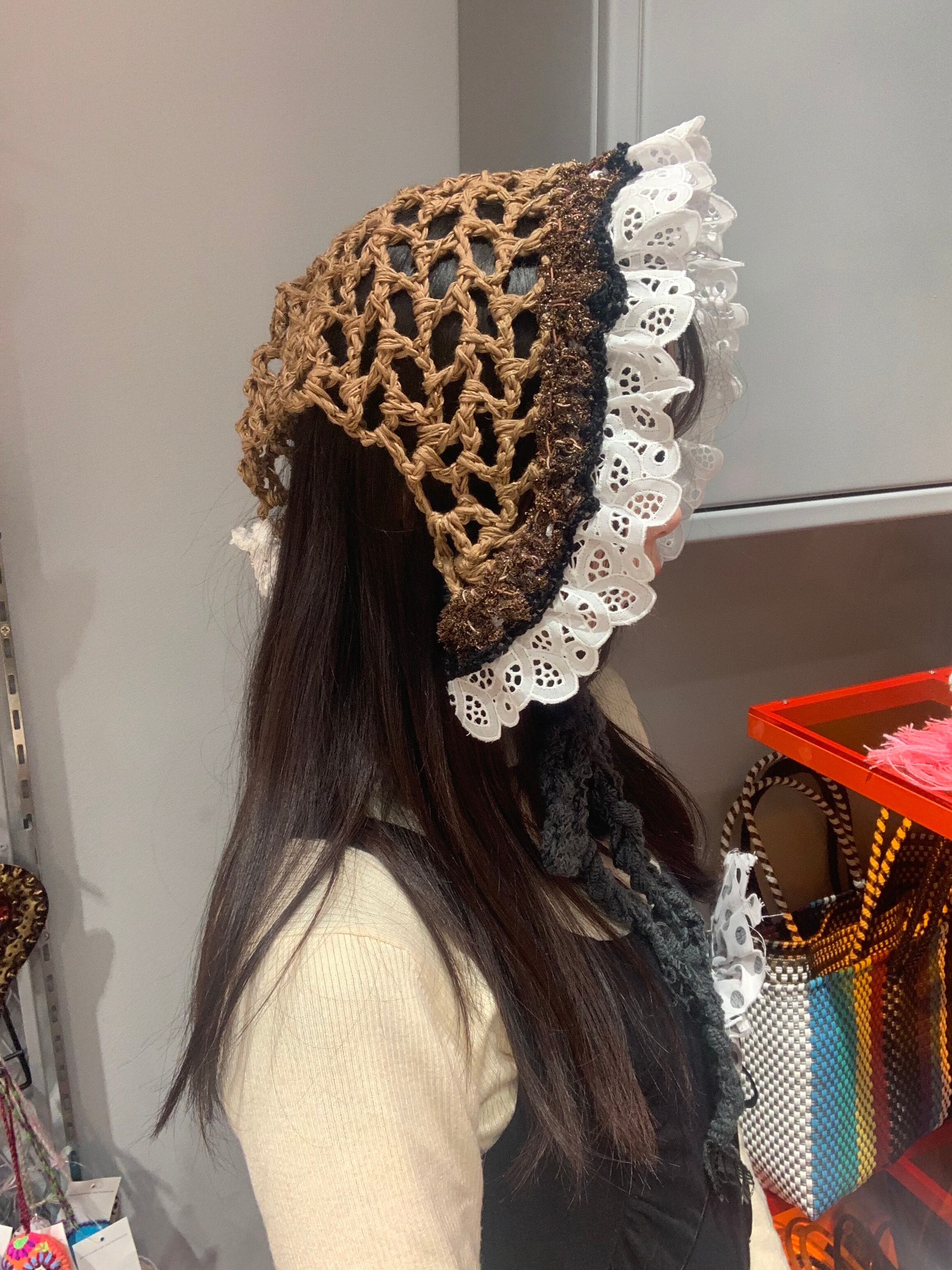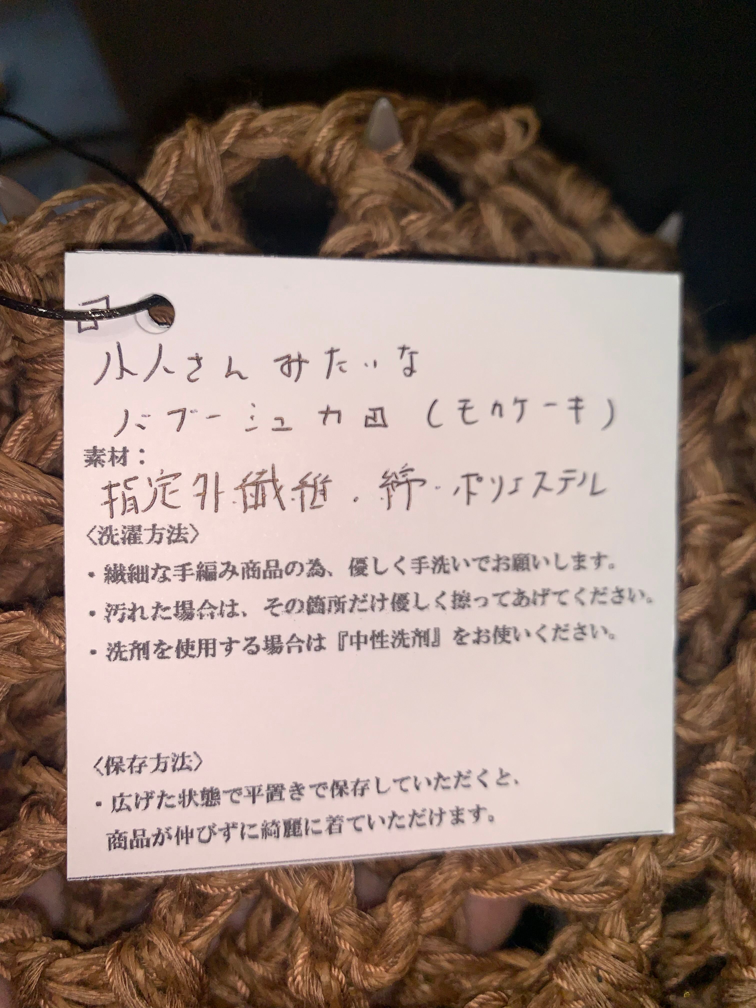 「小人さんみたいなバブーシュカ」 モカケーキ 〈素材〉 指定外繊維・綿・ポリエステル 〈洗濯方法〉 繊細な手編み商品の為、優しく手洗いでお願いします。 汚れた場合は、その箇所だけ優しく擦ってあげてください。 洗剤を使用する場合は中性洗剤をお使いください。