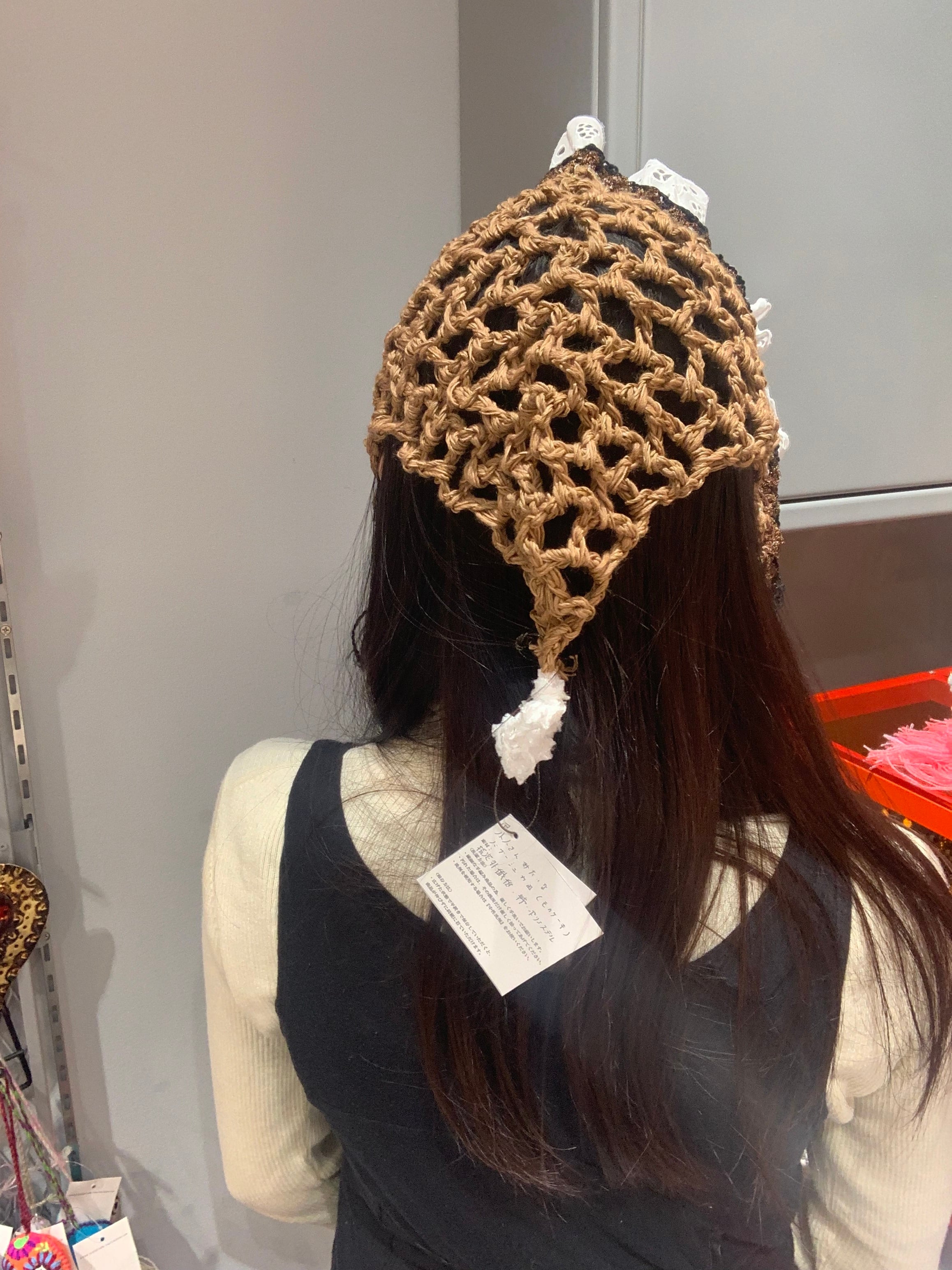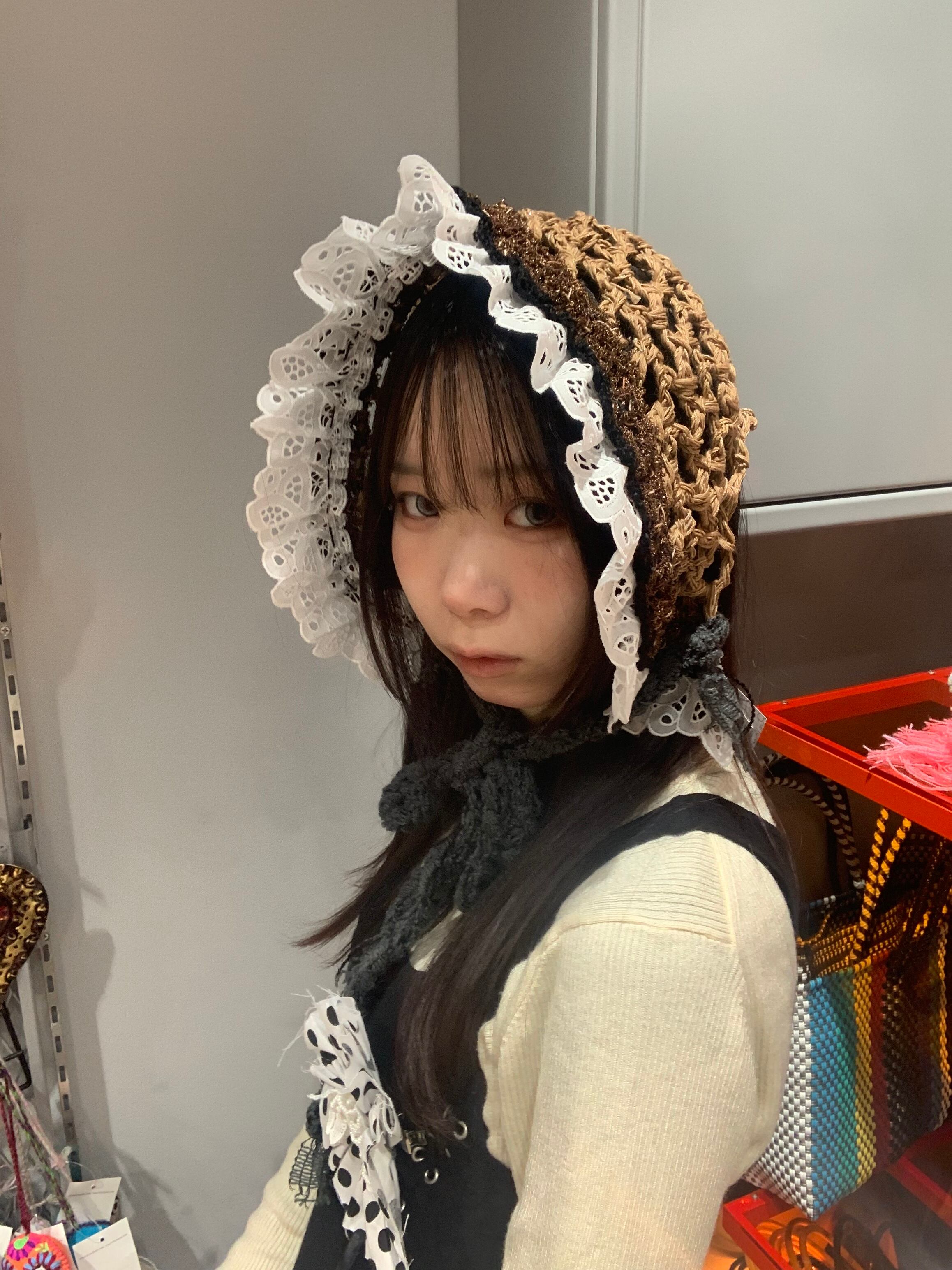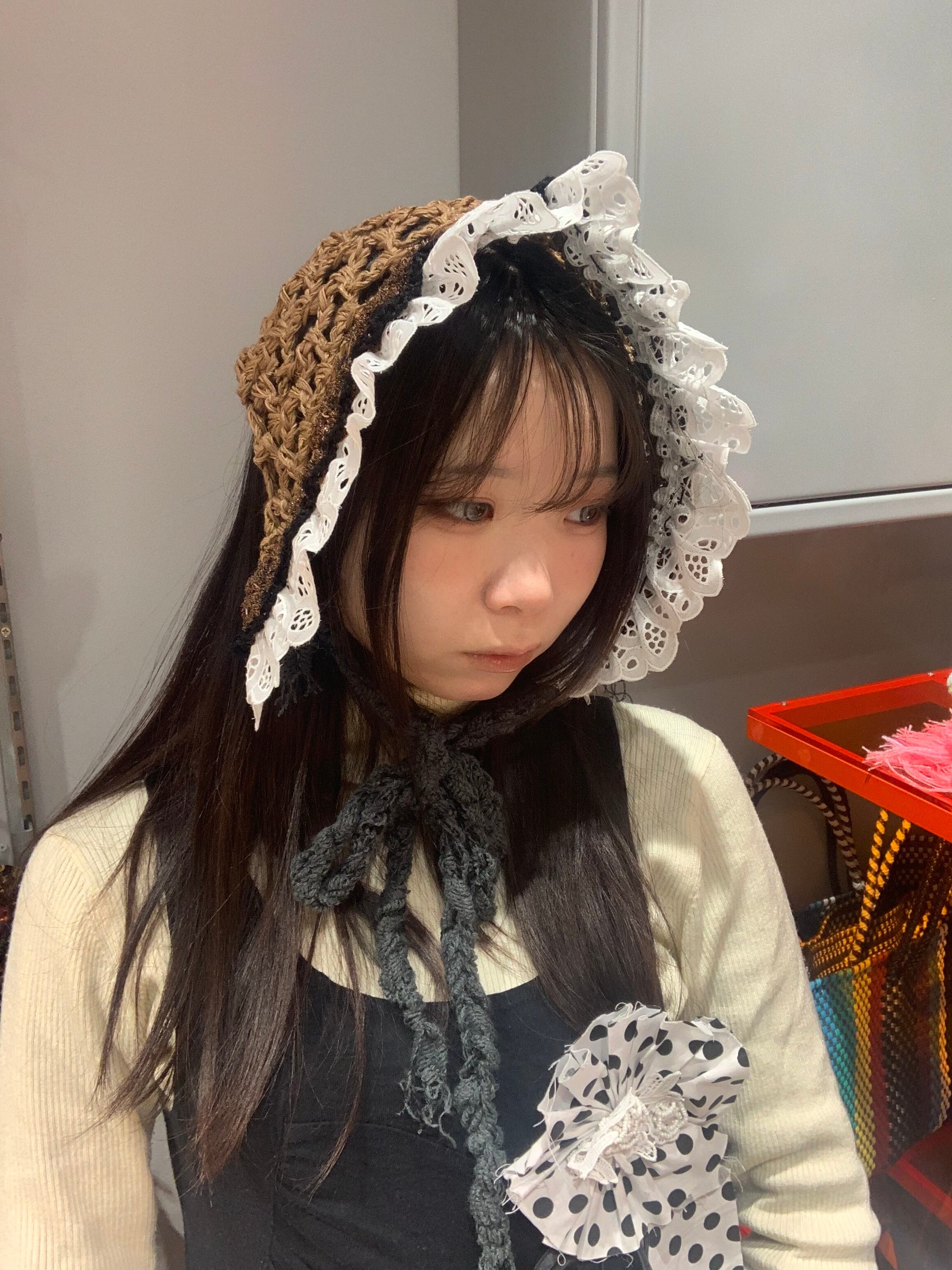 「小人さんみたいなバブーシュカ」 モカケーキ 〈素材〉 指定外繊維・綿・ポリエステル 〈洗濯方法〉 繊細な手編み商品の為、優しく手洗いでお願いします。 汚れた場合は、その箇所だけ優しく擦ってあげてください。 洗剤を使用する場合は中性洗剤をお使いください。