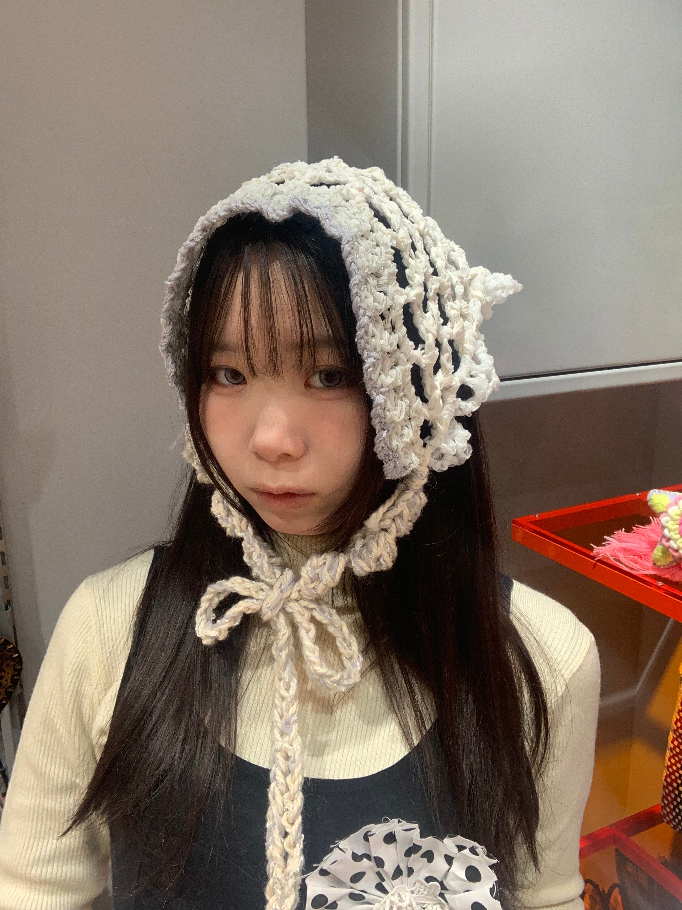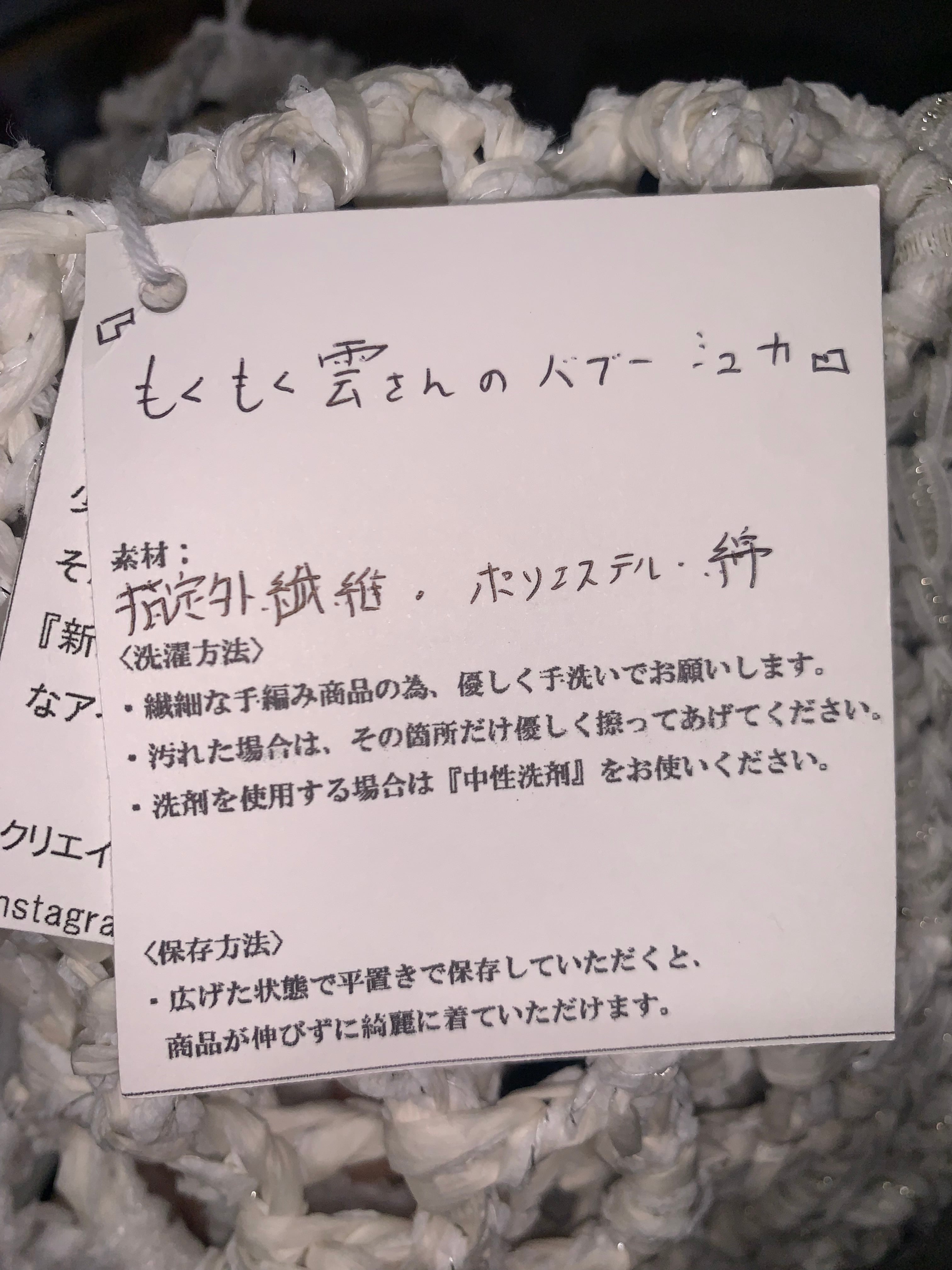 「もくもく雲さんのバブーシュカ」 〈素材〉 指定外繊維・ポリエステル・綿 〈洗濯方法〉 繊細な手編み商品の為、優しく手洗いでお願いします。 汚れた場合は、その箇所だけ優しく擦ってあげてください。 洗剤を使用する場合は中性洗剤をお使いください。