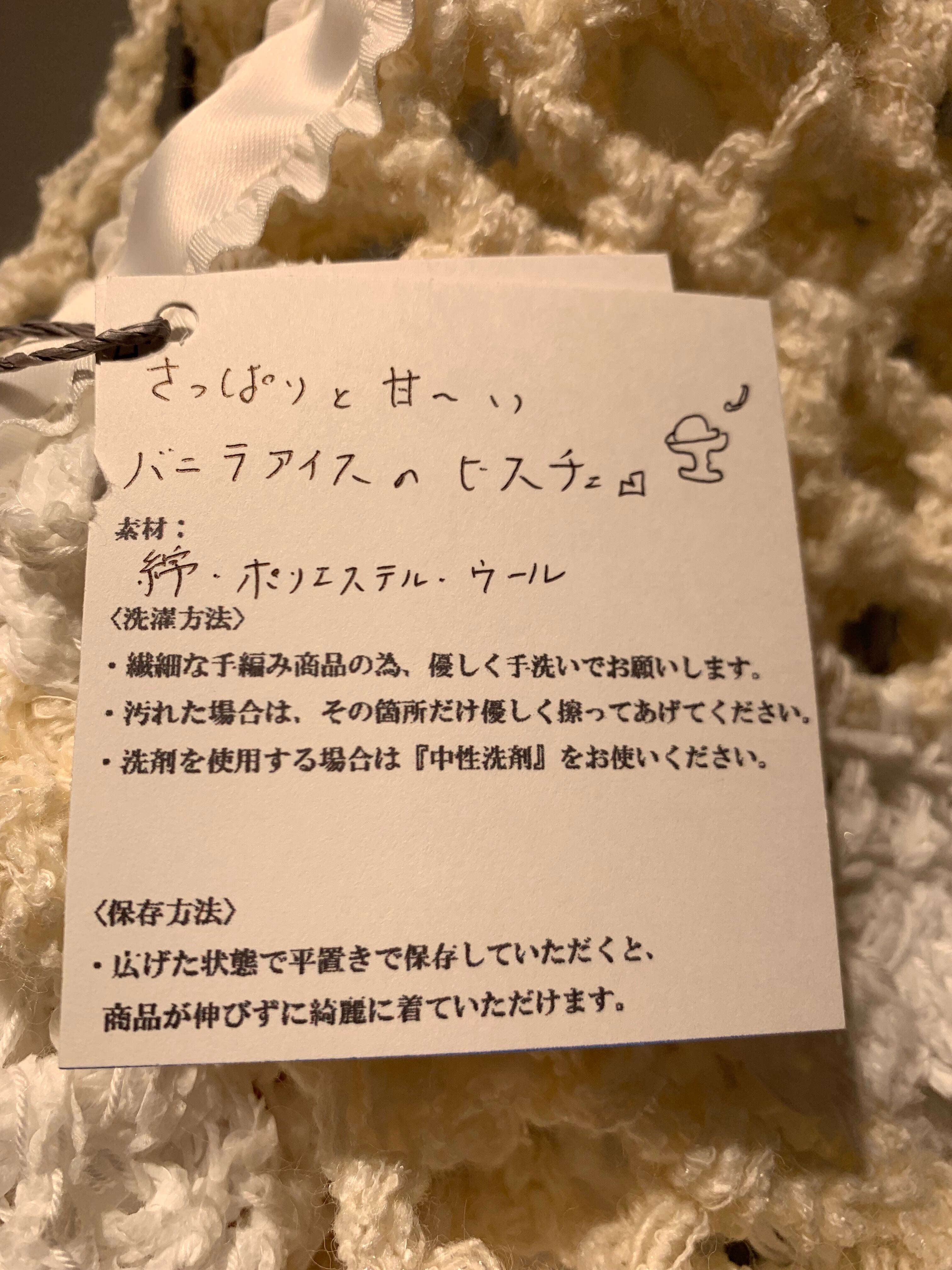 「さっぱりと甘〜いバニラアイスのビスチェ」 〈素材〉 綿・ポリエステル・ウール 〈洗濯方法〉 繊細な手編み商品の為、優しく手洗いでお願いします。 汚れた場合は、その箇所だけ優しく擦ってあげてください。 洗剤を使用する場合は中性洗剤をお使いください。