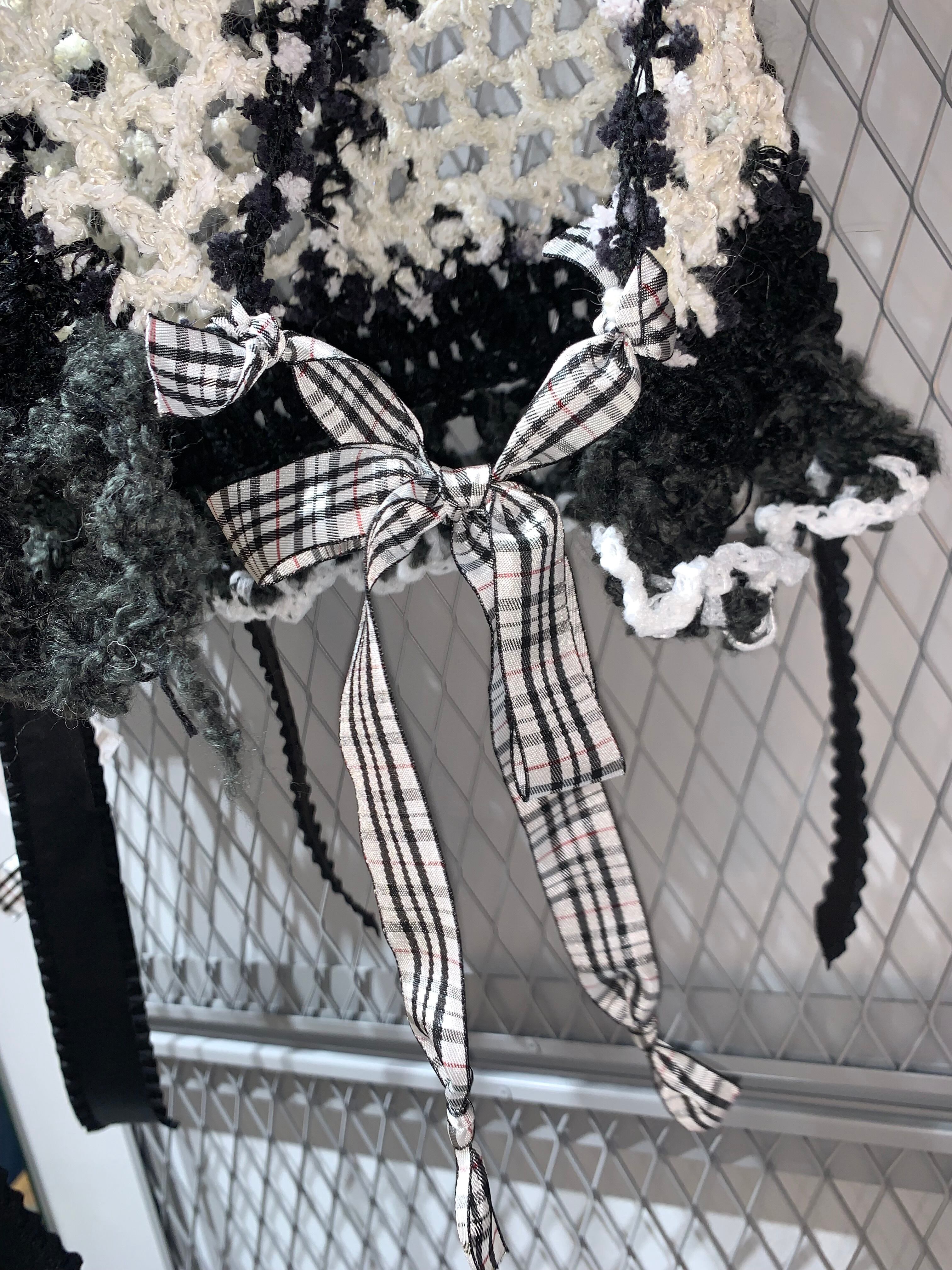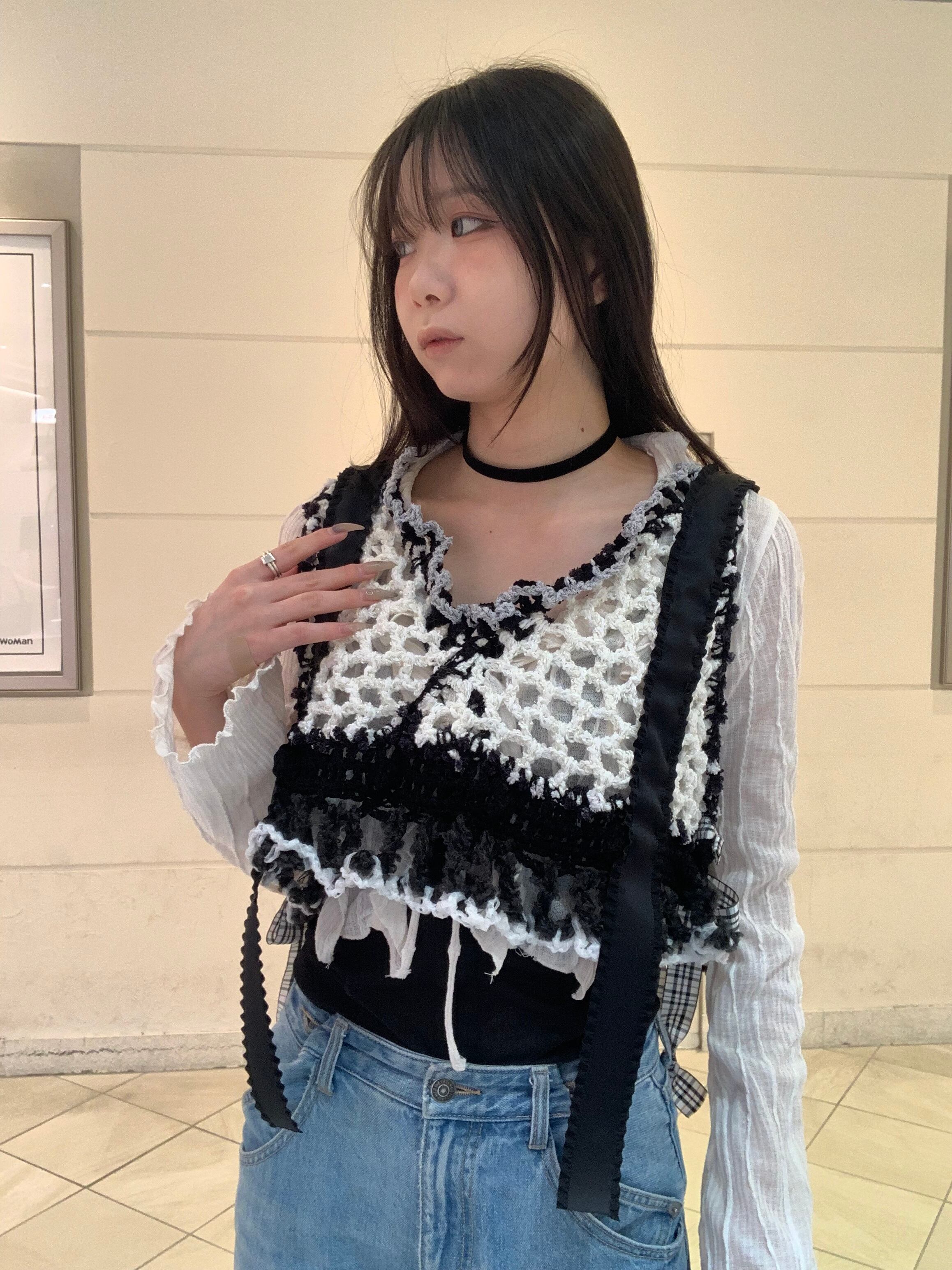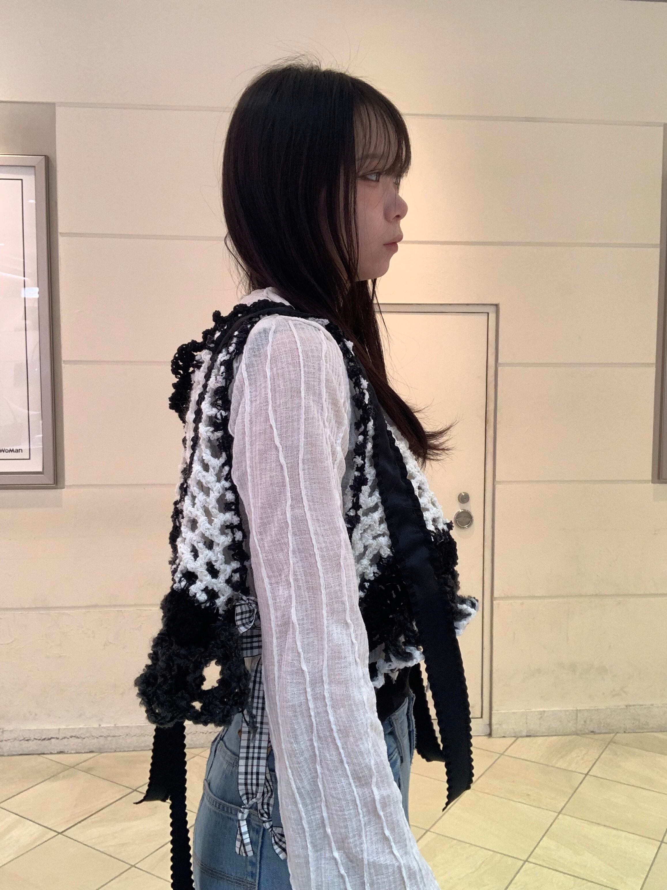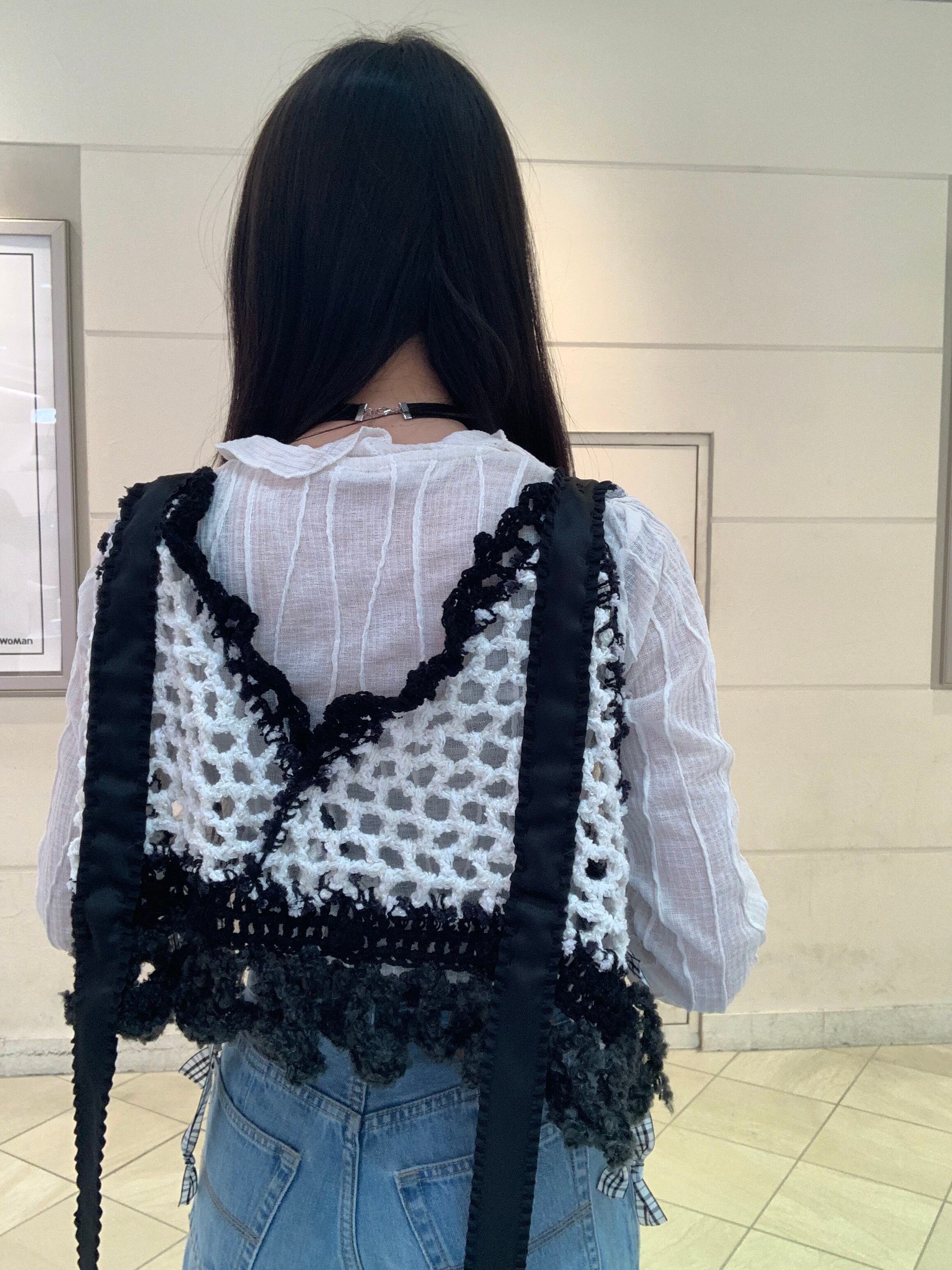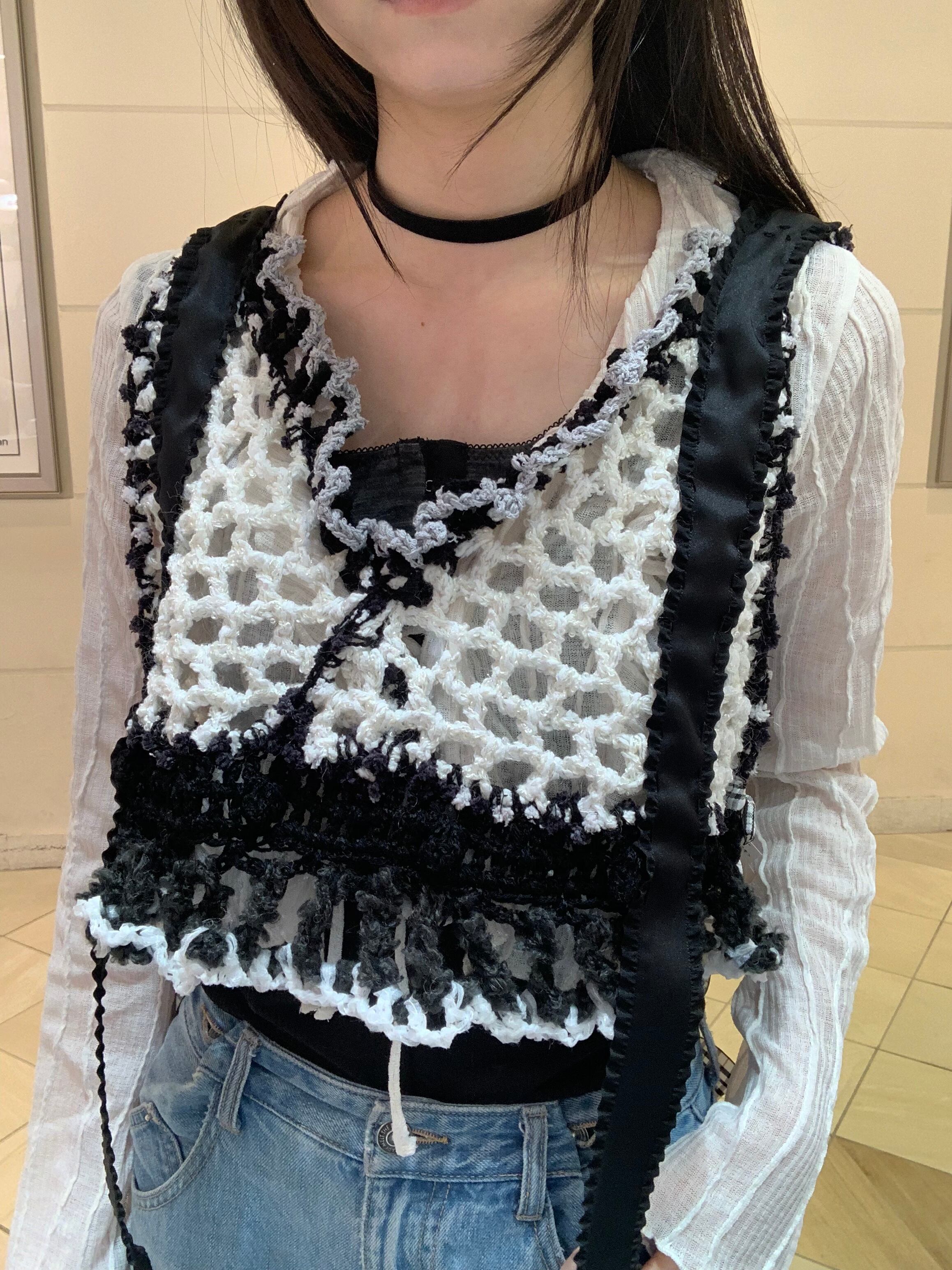 「白黒パンダのビスチェ」 〈素材〉 綿・ポリエステル・ウール 〈洗濯方法〉 繊細な手編み商品の為、優しく手洗いでお願いします。 汚れた場合は、その箇所だけ優しく擦ってあげてください。 洗剤を使用する場合は中性洗剤をお使いください。