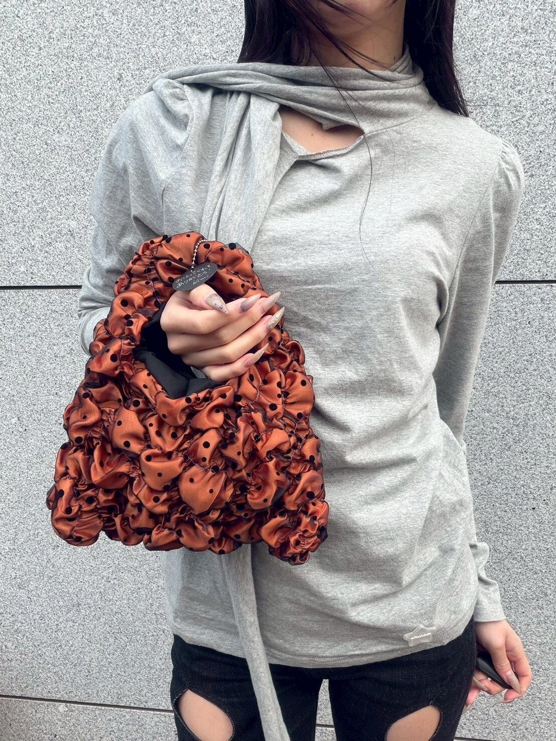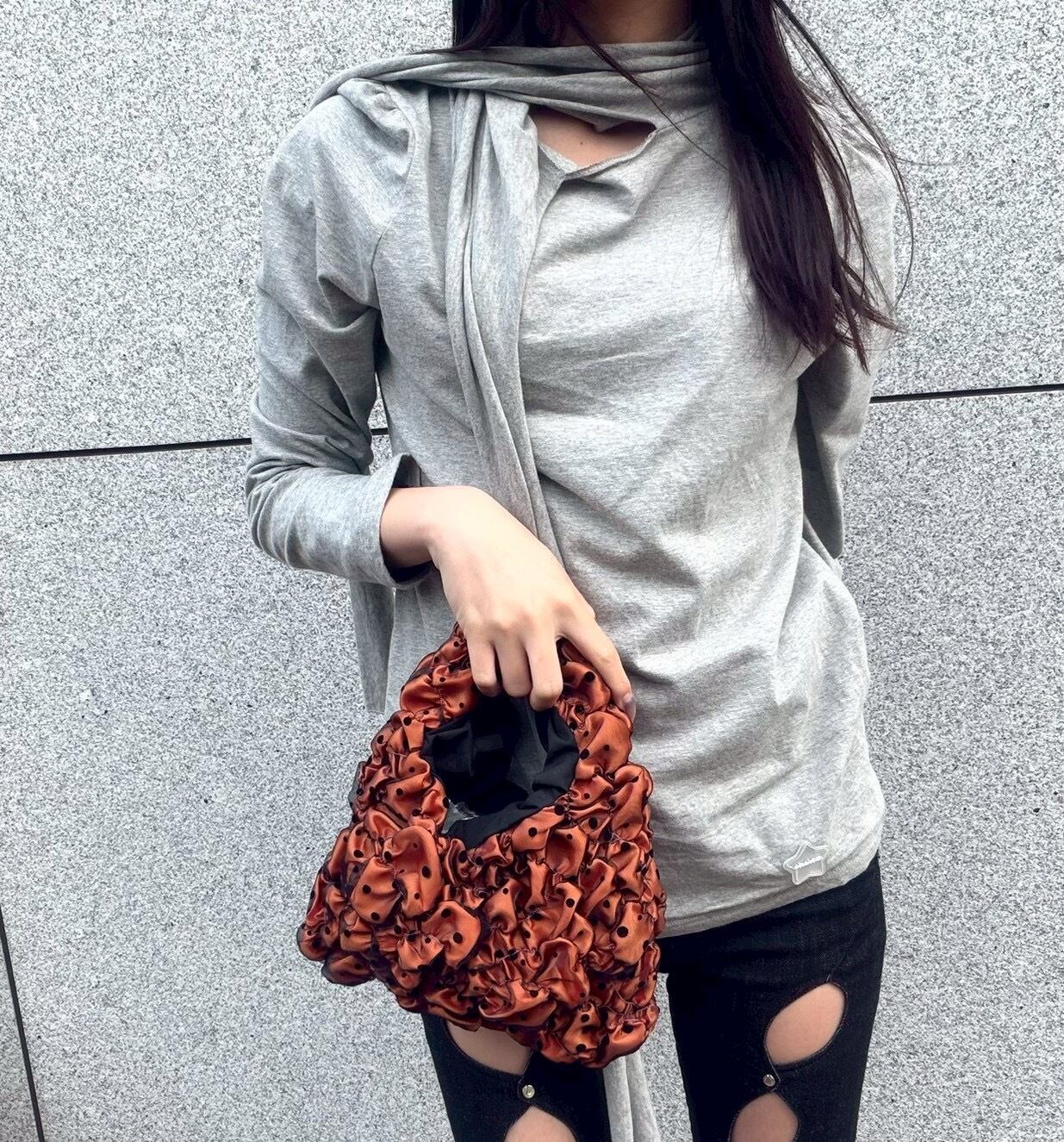 シャーリングゴムによりシルエットを作り出している為、洗濯やアイロンをすると風合いが変わる可能性があります。