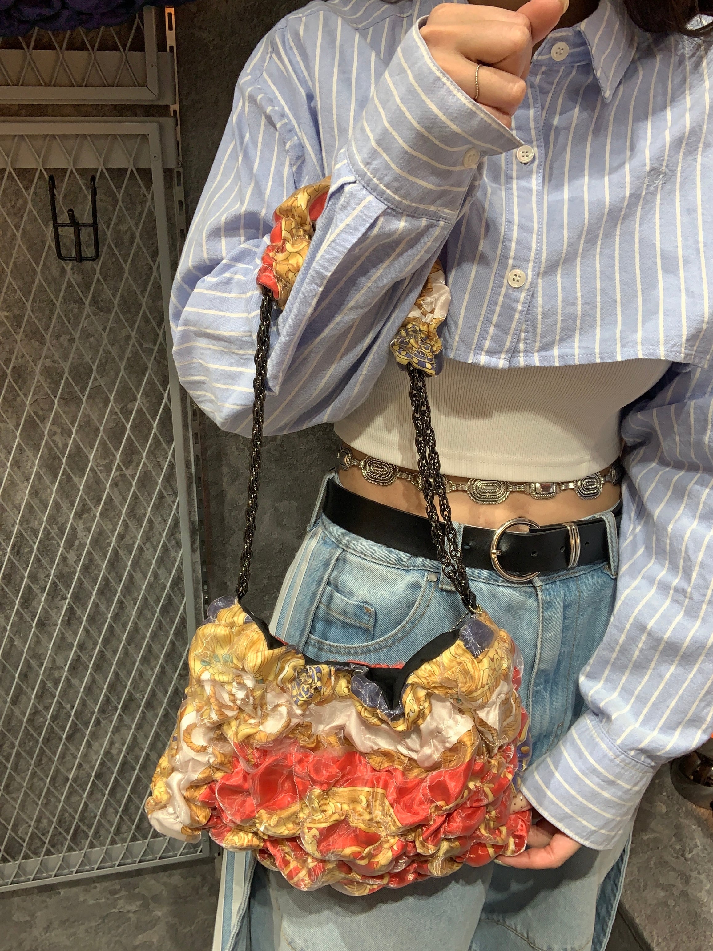 シャーリングゴムによりシルエットを作り出している為、洗濯やアイロンをすると風合いが変わる可能性があります。
